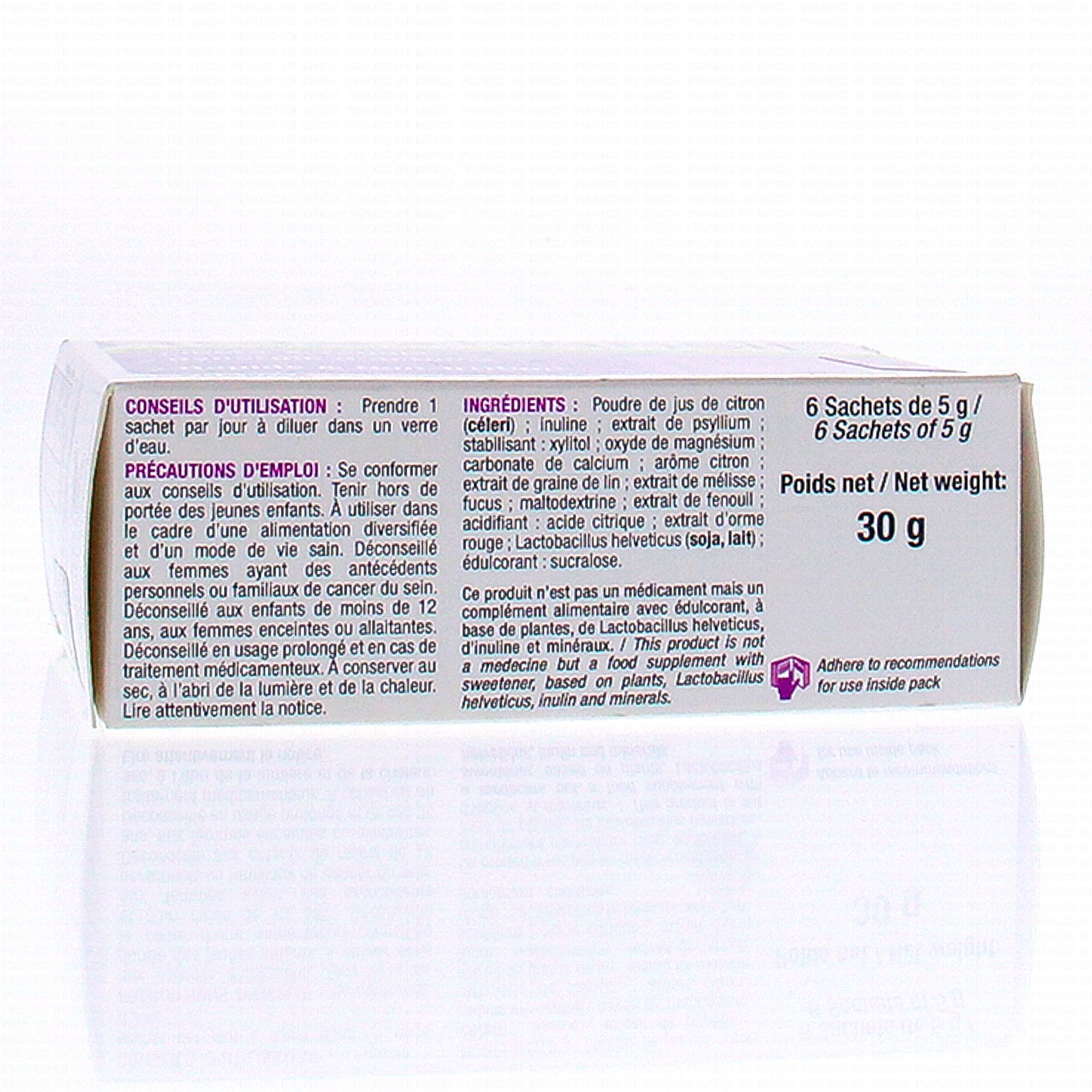 Poudre de jus de citron (céleri), inuline, extrait de psyllium, stabilisant : xylitol ; oxyde de magnésium, carbonate de calcium, arôme citron, extrait de graine de lin, extrait de mélisse, fucus, maltodextrine, extrait de fenouil, acidifiant : acide citrique ; extrait d'orme rouge, lactobacillus helveticus (soja, lait), édulcorant : sucralose.