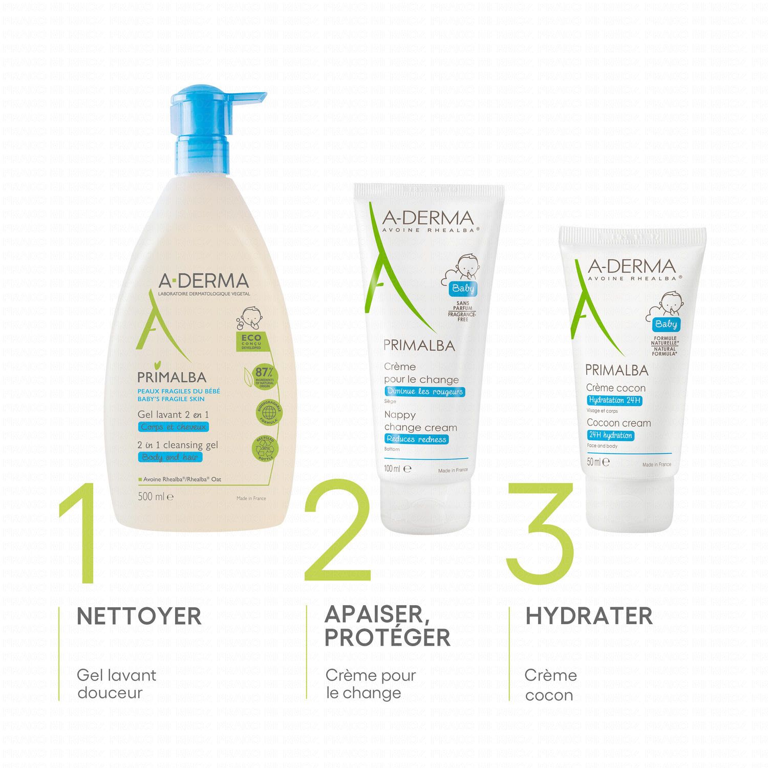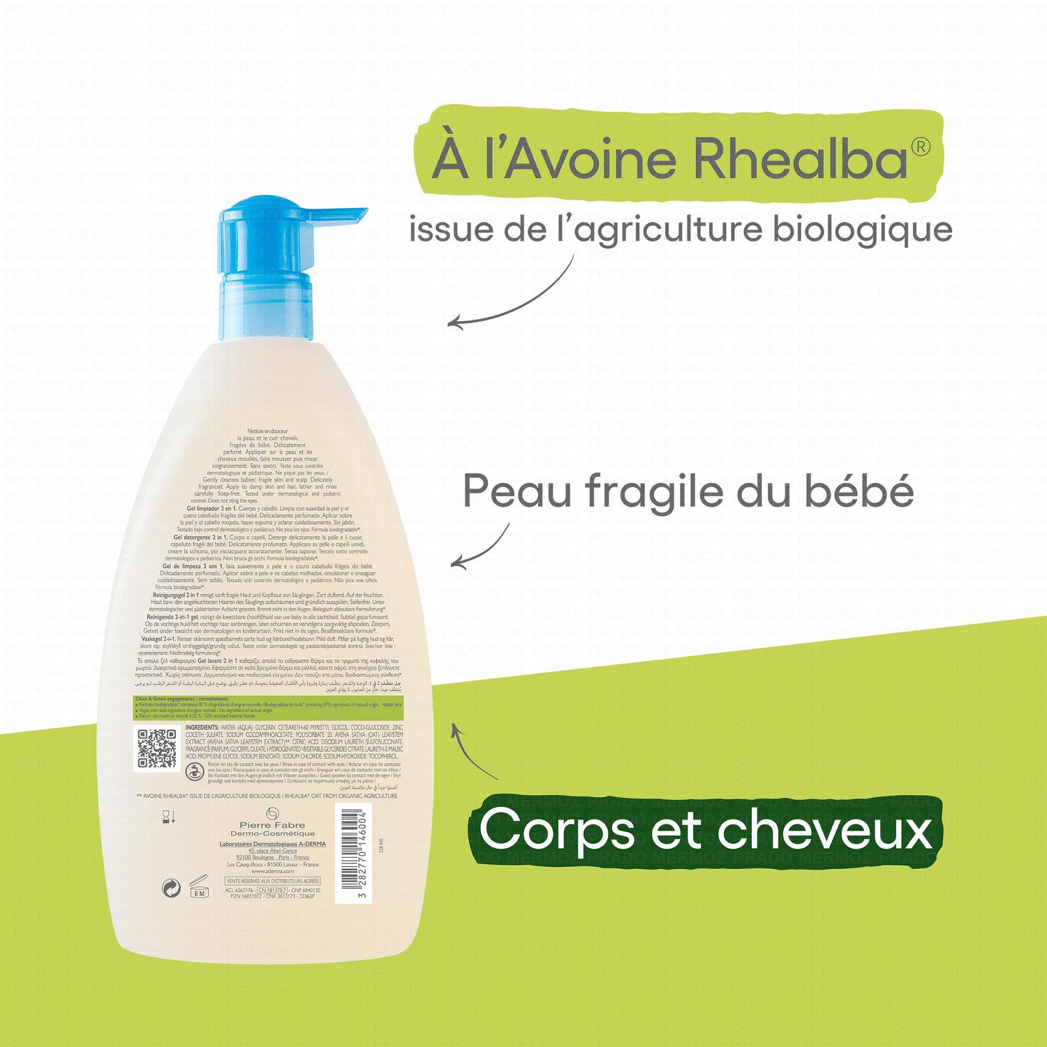 Hygiène quotidienne du nourrisson. Peaux fragiles. Corps et cheveux. Sans savon, sans alcool, sans paraben, sans colorant, sans huile essentielle. Hypoallergénique. Ne pique pas les yeux. Testé sous contrôle dermatologique et pédiatrique.
