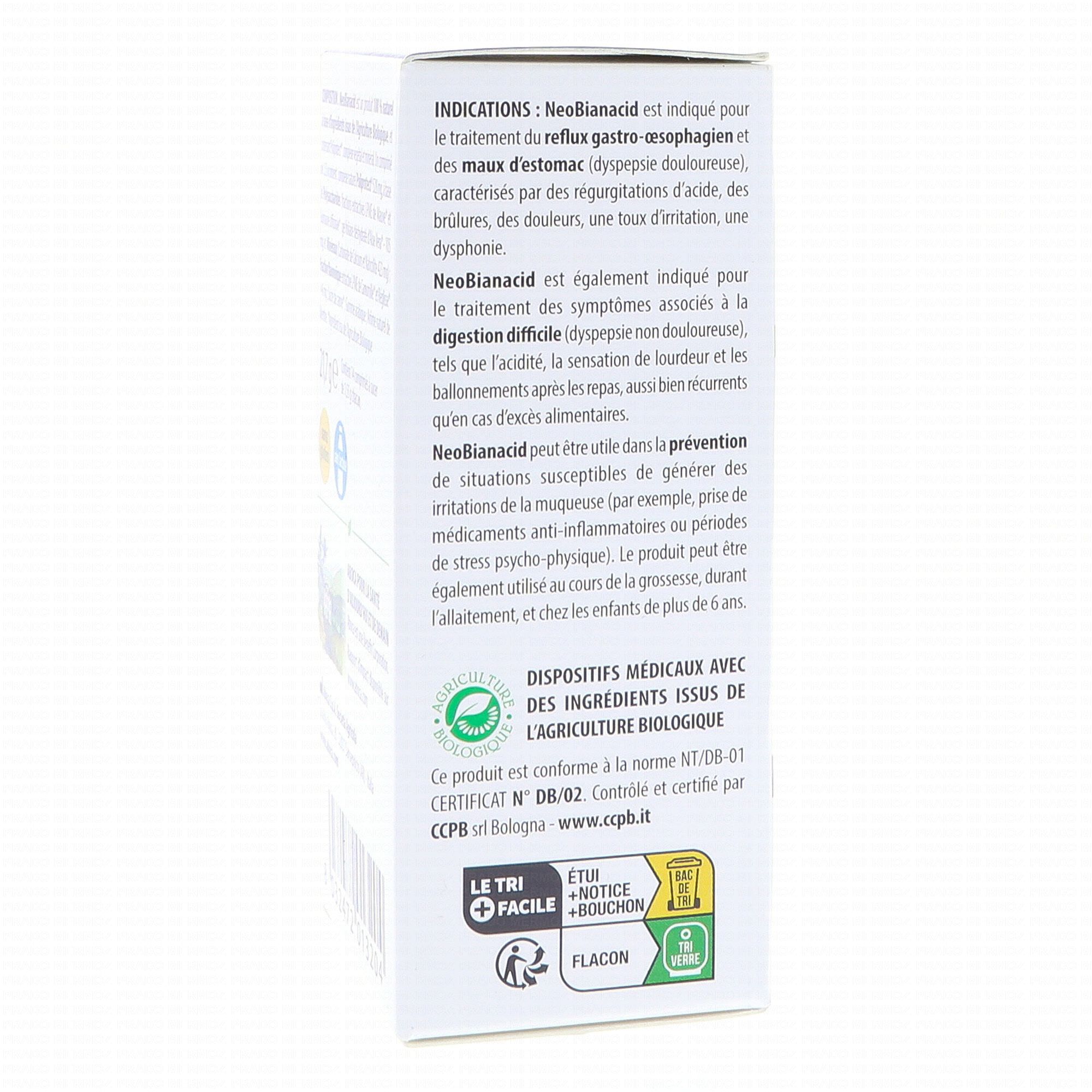 ABOCA NeoBianacid est un dispositif médical en comprimés à sucer qui contient le complexe naturel Poliprotect®, à base de Polysaccharides (extraits de la mauve, de guimauve officinale, et de gel foliaire déshydraté d'aloe vera) et Minéraux. Il contient également une fraction flavonoïque extractive de camomille et de réglisse.