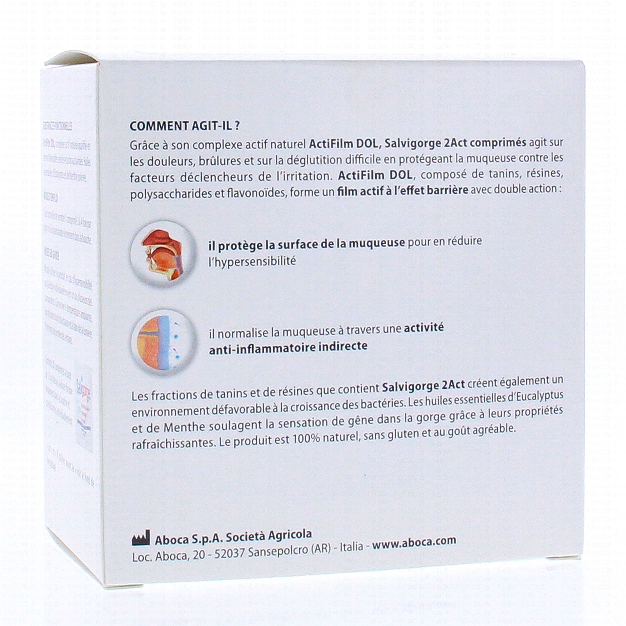 Salvigorge 2Act calme la douleur et l'irritation en protégeant la muqueuse oropharyngée. Il est disponible en deux formats : comprimés à sucer et spray.