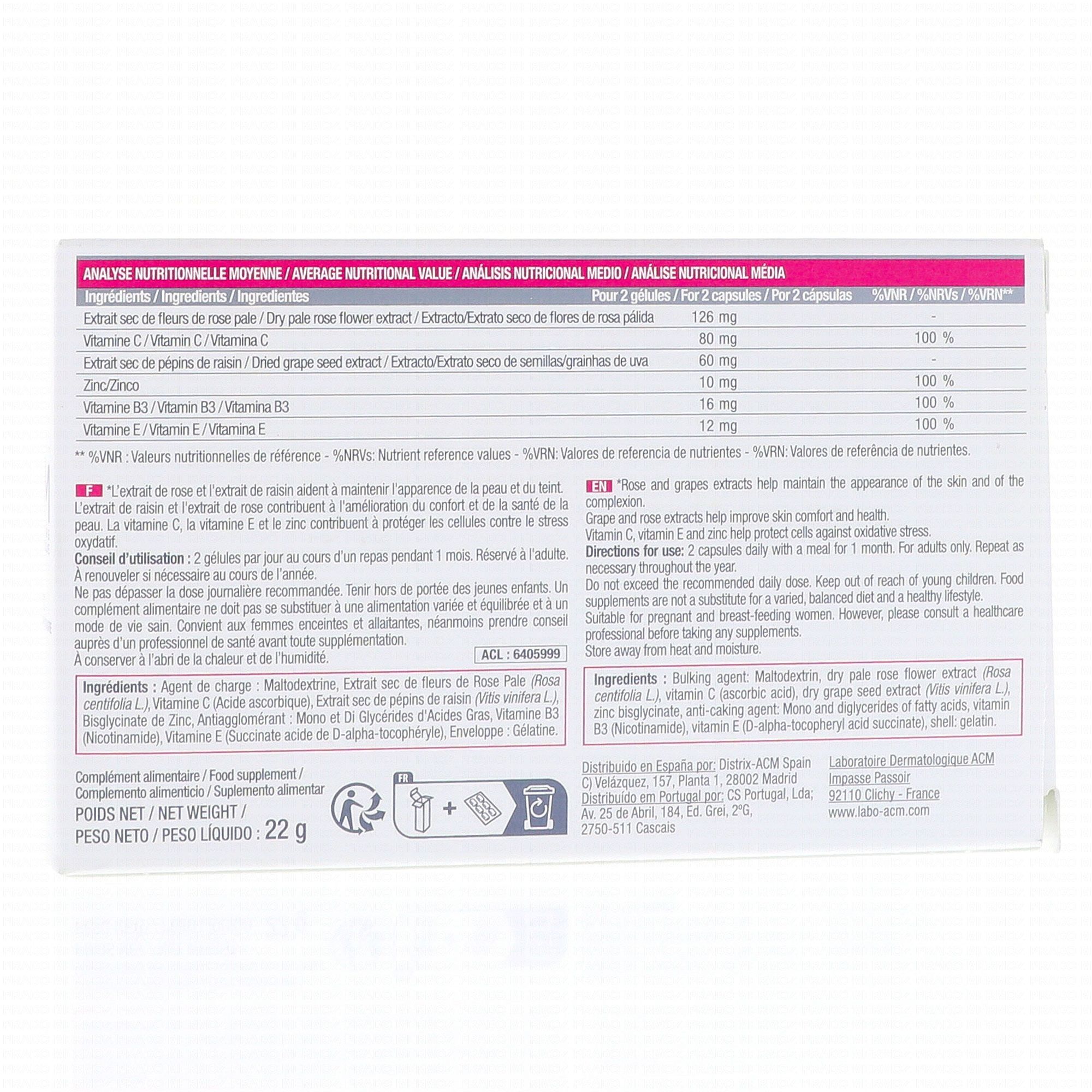 Agent de charge ; maltodextrina, extrait sec de fleurs de rose pale (rosa centifolia L.), vitamine C (acide ascorbique), extrait sec de pépins de raisin (vitis vinifera L.), bisglycinate de zinc, antiagglomérant : mono et di glycérides d'acides gras, vitamine B3 (nicotinamide), vitamine E (succinate acide de D-alpha-tocophéryle), enveloppe : gélatine.