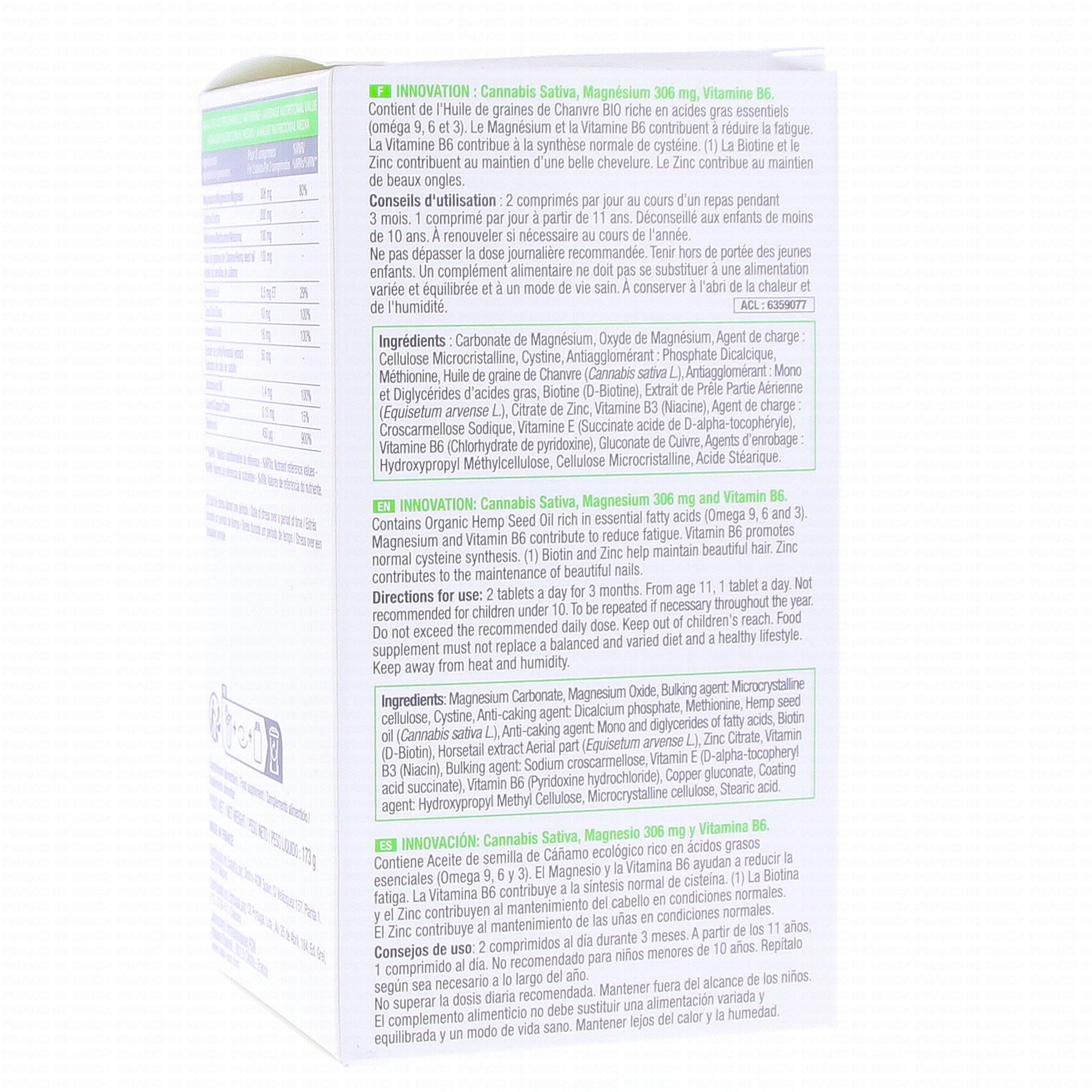 Carbonate de Magnésium, Oxyde de magnésium, Agent de charge : cellulose Microcristalline, cystine, antiagglomérant : Phosphate Dicalcique, Méthionine, Huile de graine de Chanvre (Cannabis sativa L.), Antiagglomérant : Mono et Diglycérides d'acides gras, Biotine (D-Biotine), Extrait de Prêle Partie Aérienne (Equisetum Arvense L.), Citrate de Zinc, Vitamine B3 (Niacine), Agent de Charge : Croscarmellose Sodique, Vitamine E (Succinate acide de D-alpha-tocophéryle), Vitamine B6 (Chlorhydrate de Pyridoxine), Gluconate de Cuivre, Agents d'enrobage : Hydroxypropyl Méthylcellulose, Cellulose Microcristalline, Acide Stéarique.