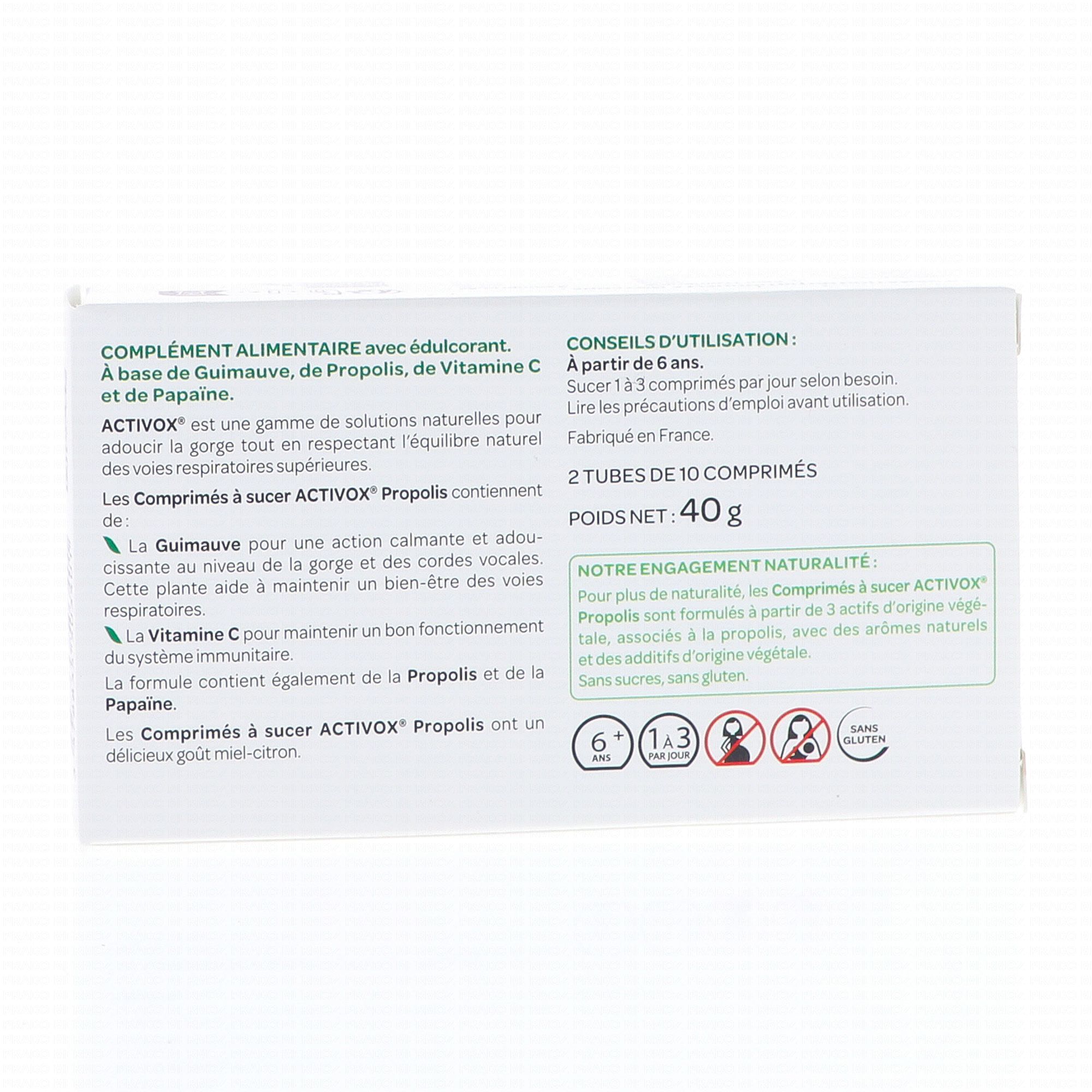 ARKOPHARMA Activox propolis - Adoucit la gorge 20 comprimés à sucer contient les éléments suivants :