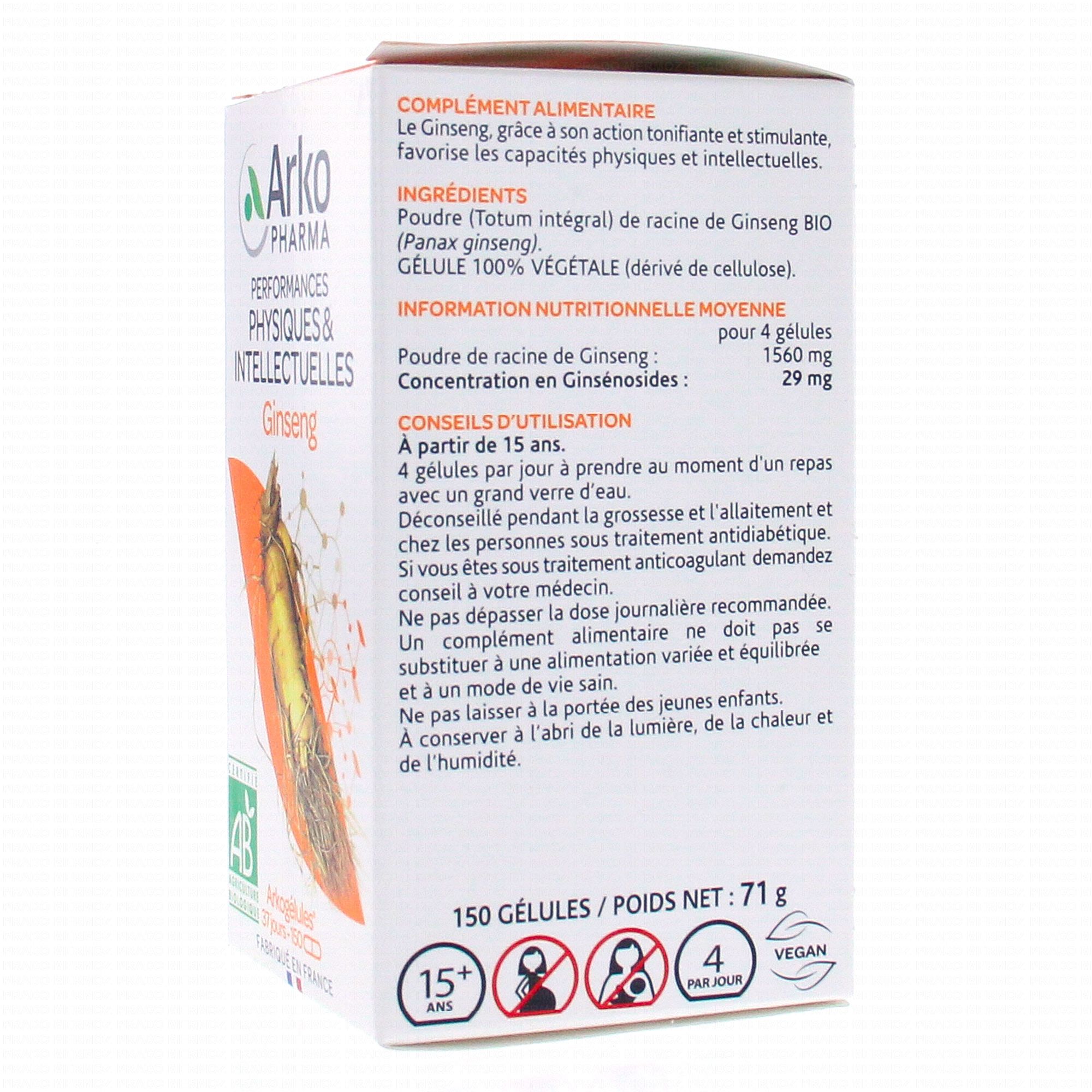ARKOPHARMA Ginseng 1560 mg de racine Bio 150 gélules est un complément alimentaire qui contribue à favoriser le bon fonctionnement du système immunitaire. Le Ginseng joue également un rôle dans la concentration et la coordination.