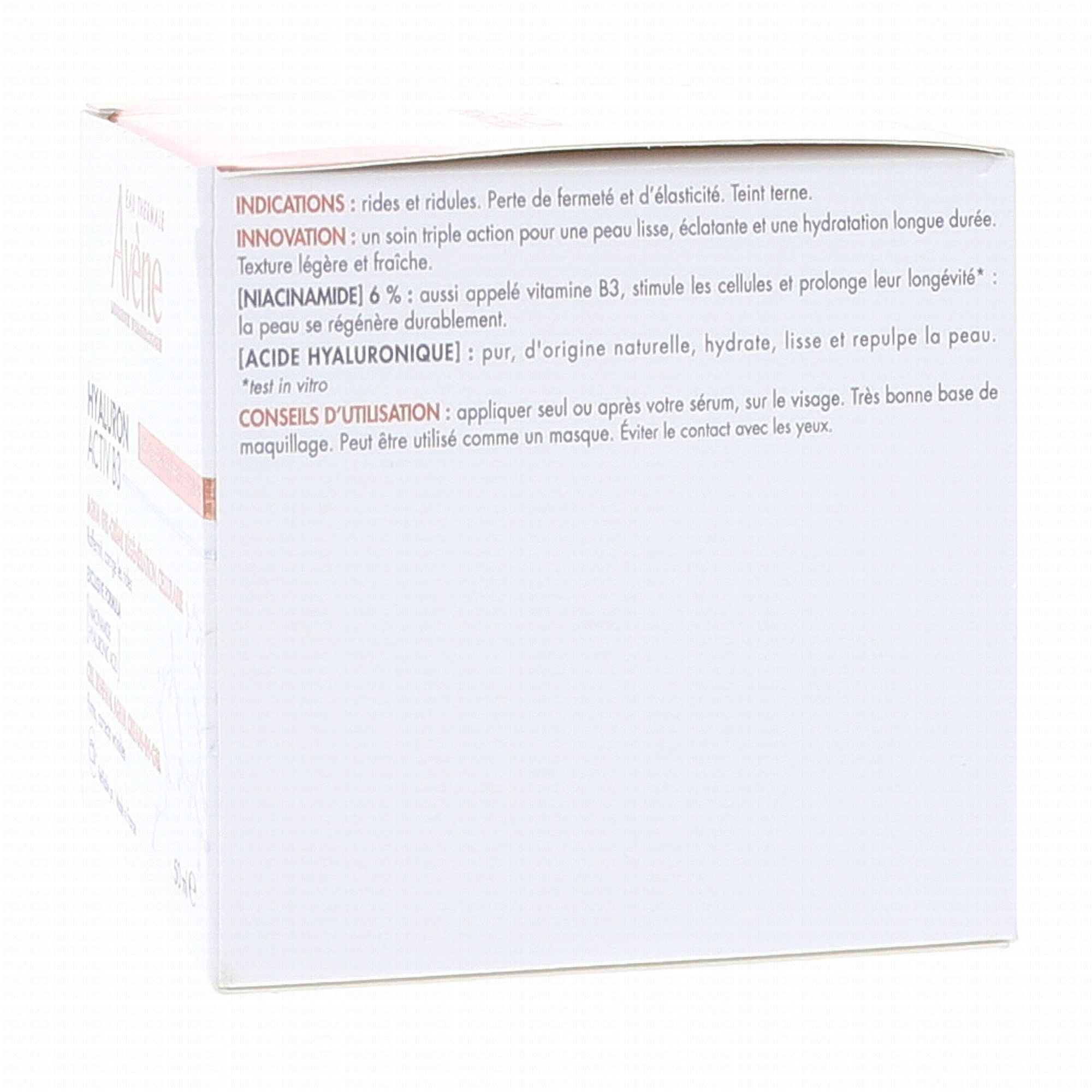 Le gel-crème Hyaluron Activ B3 est composé à 6% de niacinamide appelé aussi vitamine B3, qui stimule les cellules et prolonge leur longévité pour une peau durablement régénérée, et d'acide hyaluronique pur d'origine naturelle, qui hydrate, lisse et repulpe la peau intensément. Ce soin complet permet de réduire les rides et ridules, diminue la perte de fermeté et d'élasticité et éclaire le teint.
