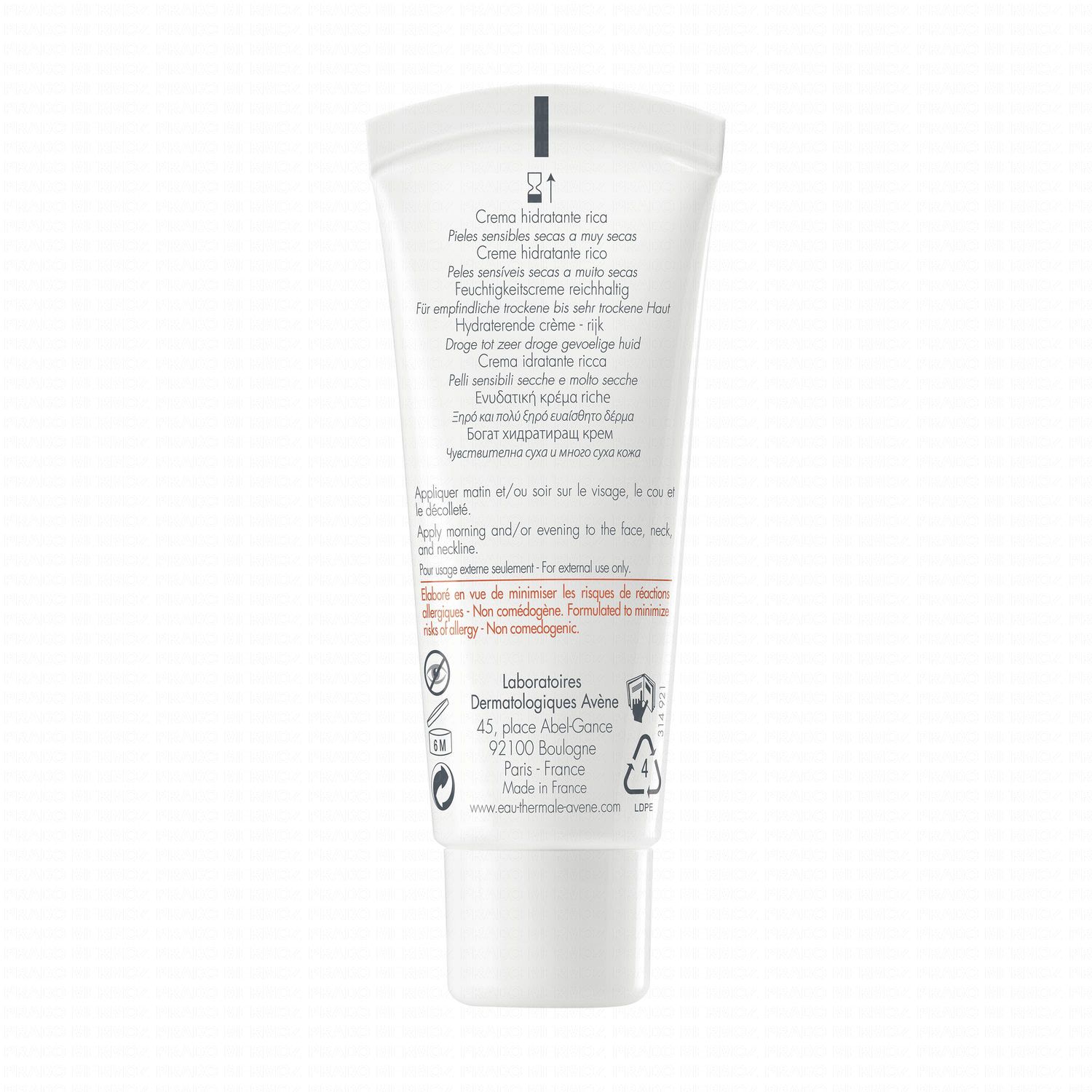 Formule INCI : Avene aqua, Paraffinum liquidum, glycerin, PPG-15 stearyl ether, cyclomethicone, cetearyl alcohol, Carthamus tinctorius, glyceryl stearate, PEG-100 stearate, butyrospermum parkii, cetearyl glucoside, benzoic acid, betasitosterol, BHT, C13-14 isoparaffin, chlorphenesin, disodium EDTA, fragance, glycine soja, laureth-7, phenoxyethanol, poloxamer 188, polyacrylamide, sodium chondroitin sulfate, sodium hydroxide, Aqua, xanthan gum.