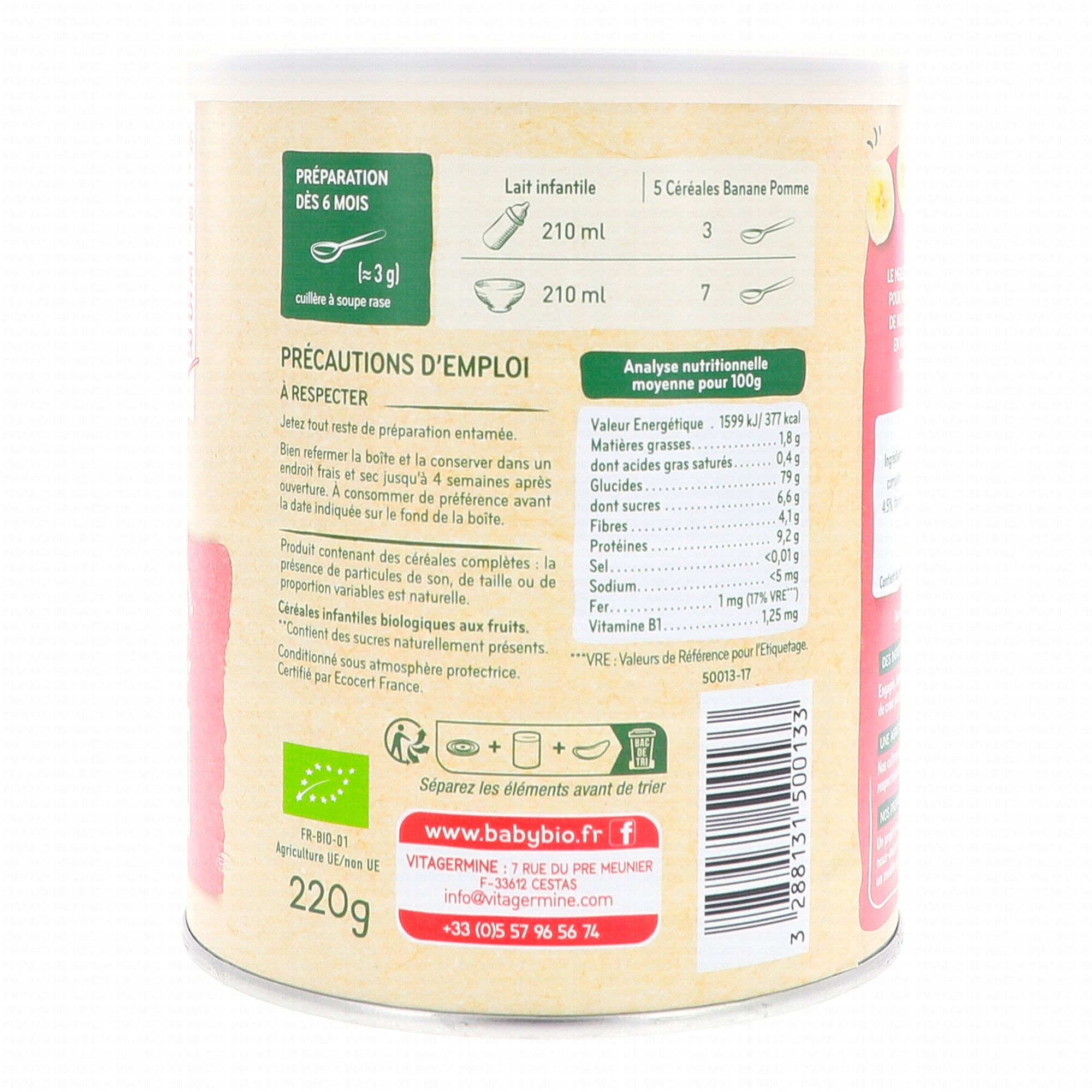 Préparation aux 5 céréales riz, blé, avoine, seigle, quinoa saveur banane, pommeSans sucres ajoutés, source de fibres et de fer. Article non repris, non échangé.