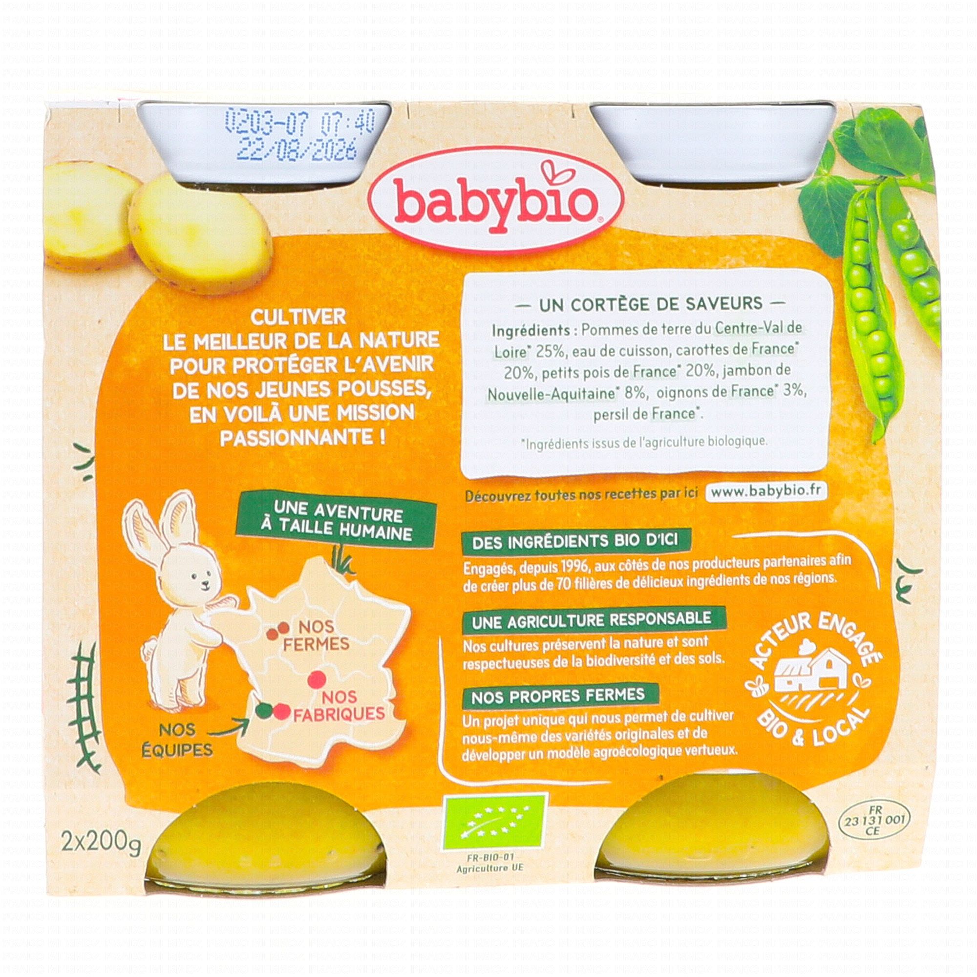 BABYBIO Petits pots Pomme de terre du Centre-Val de Loire, Petits Pois et Jambon de Nouvelle-Aquitaine 2x200g dès 8mois