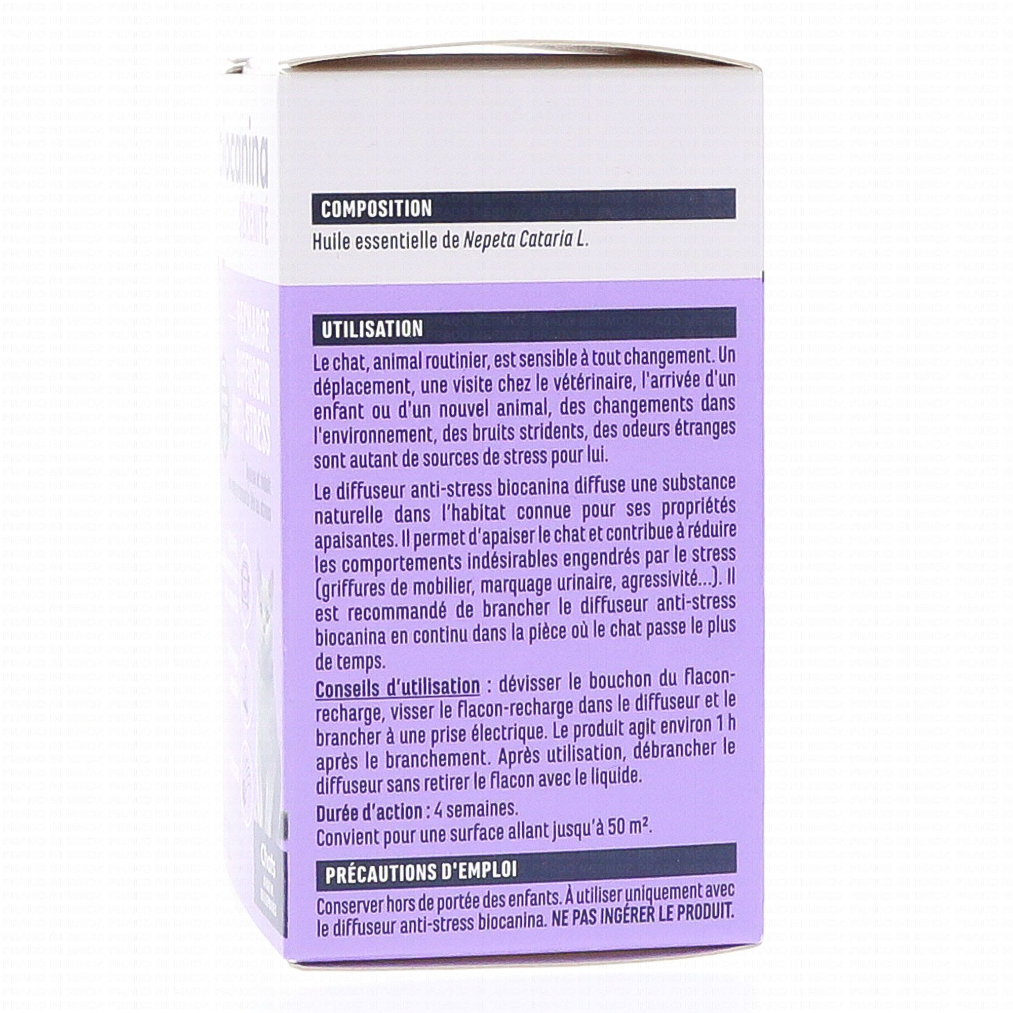 Le diffuseur anti-stress biocanina diffuse une substance naturelle dans l'habitat connue pour ses propriétés apaisantes chez le chat. Il permet d'apaiser le chat et contribue à réduire les comportements indésirables engendrés par le stress (griffures de mobilier, marquage urinaire, agressivité, agitation, miaulements lors de transports …).