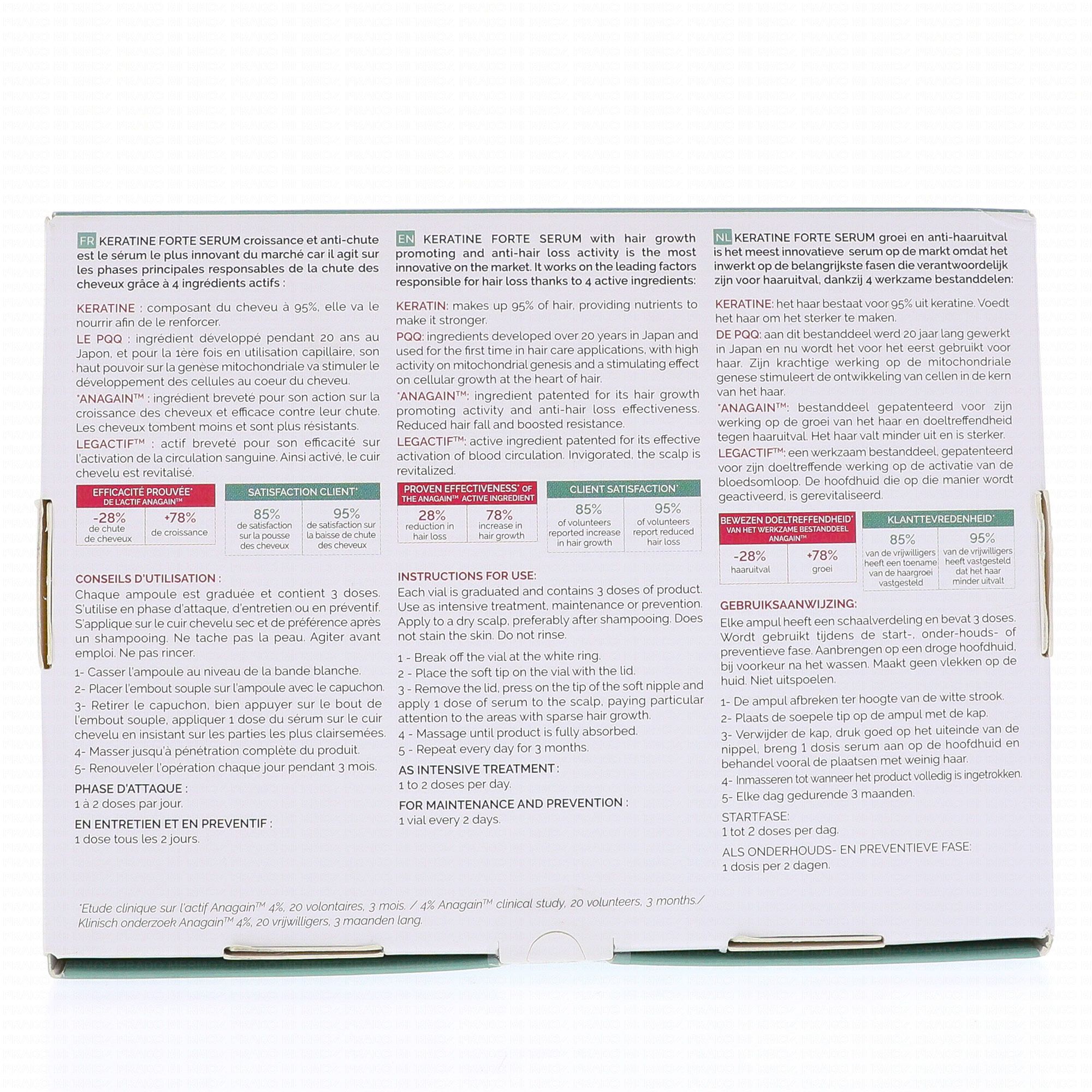 KERATINE FORTE SERUM est formulé à base kératine, pqq pour booster les cellules responsables de la croissance capillaire, anagain® pour relancer le cycle de vie du cheveu et legactif® pour favoriser la circulation sanguine du cuir chevelu avec une efficacité prouvée : -28% de chute de cheveux et +78% de croissance après 3 mois d'utilisation (Étude scientifique Anagain, 20 volontaires sur 3 mois).