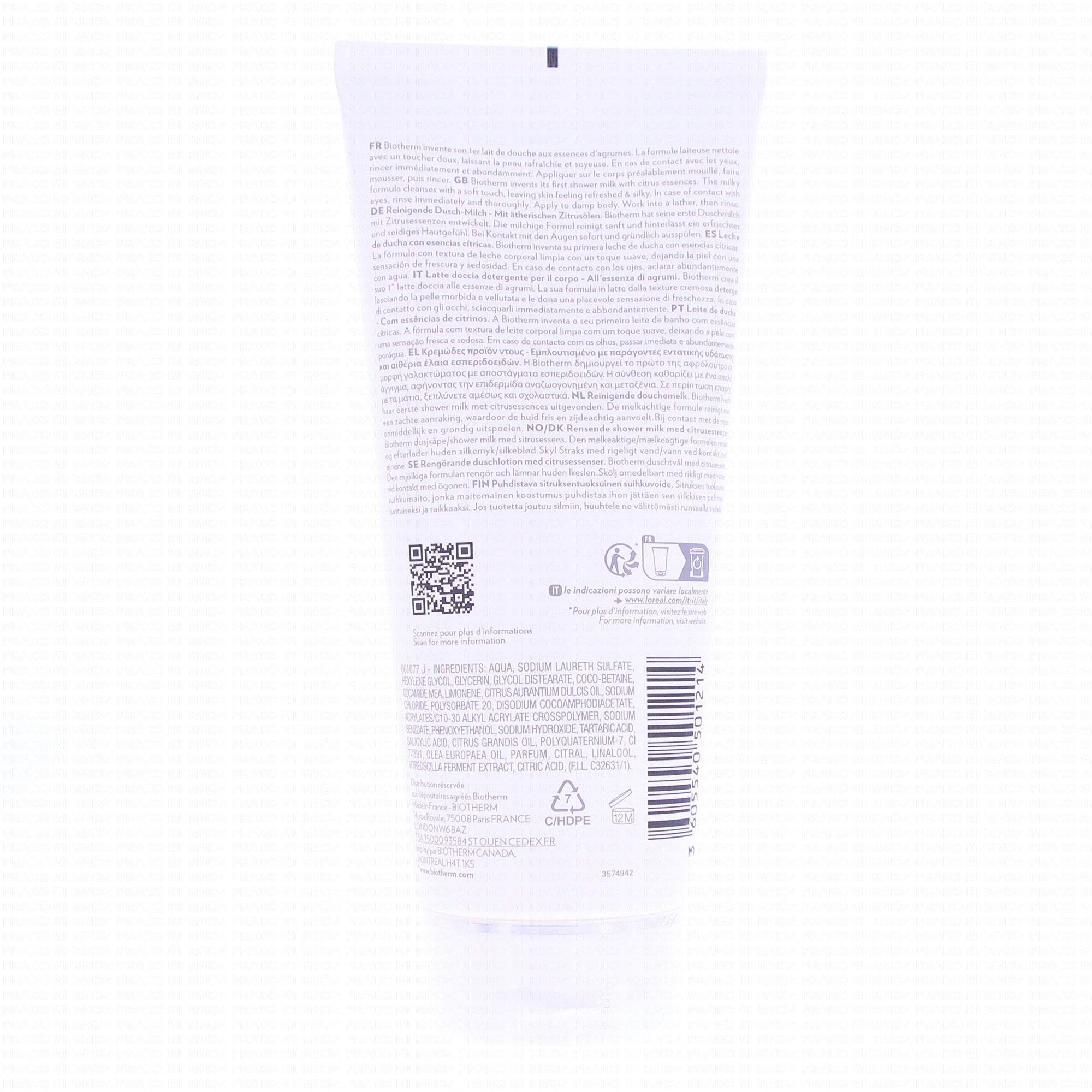 Nettoyez votre peau tout en la nourrissant avec le Lait de Douche Biotherm au parfum rafraîchissant d'agrumes.