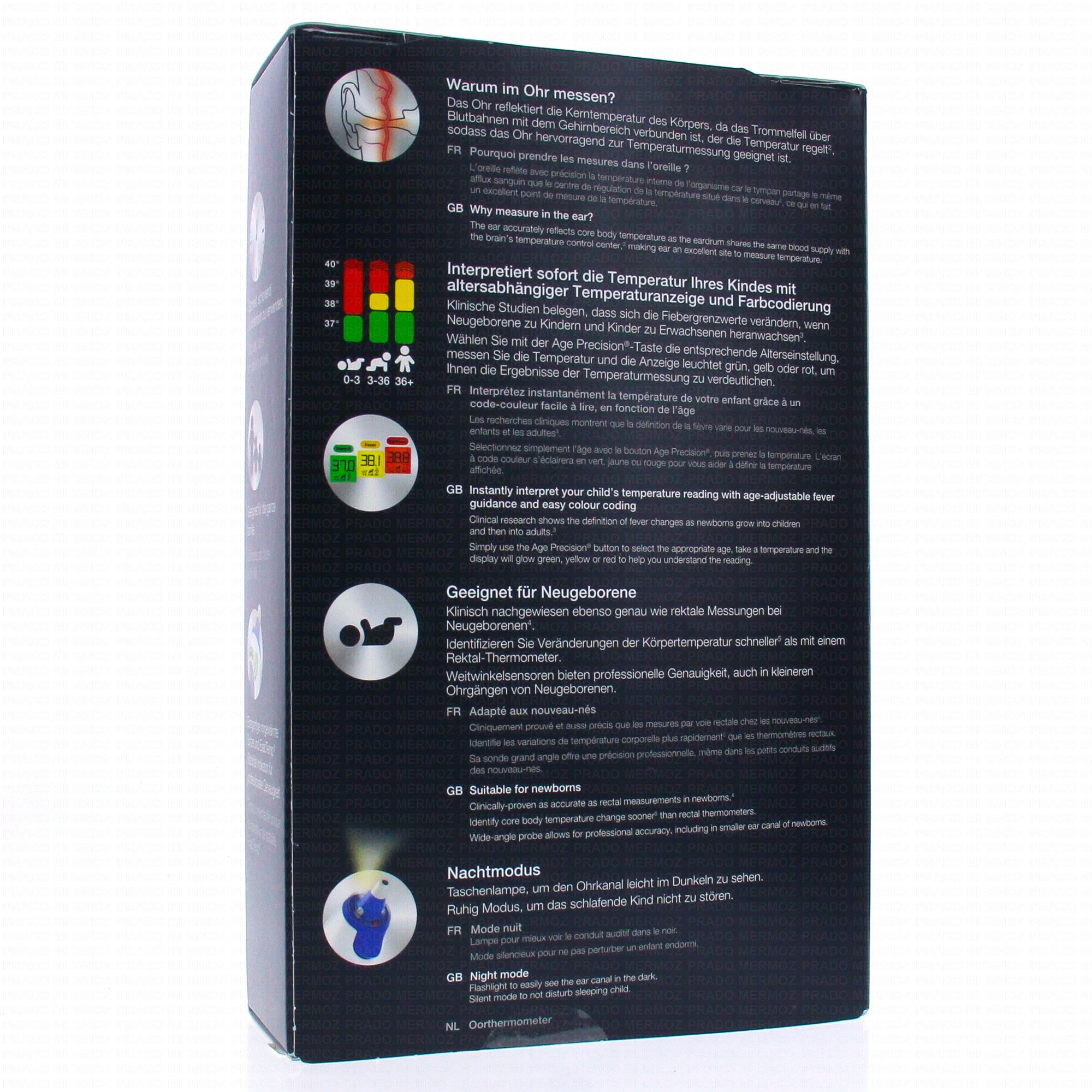 Rapide, doux, facile à utiliser. Enregistre les 9 dernières températures. Ecran à code couleur Age Precision. Système de position unique qui s'éclaire et qui bipe pour confirmer que l'appareil est bien placé.