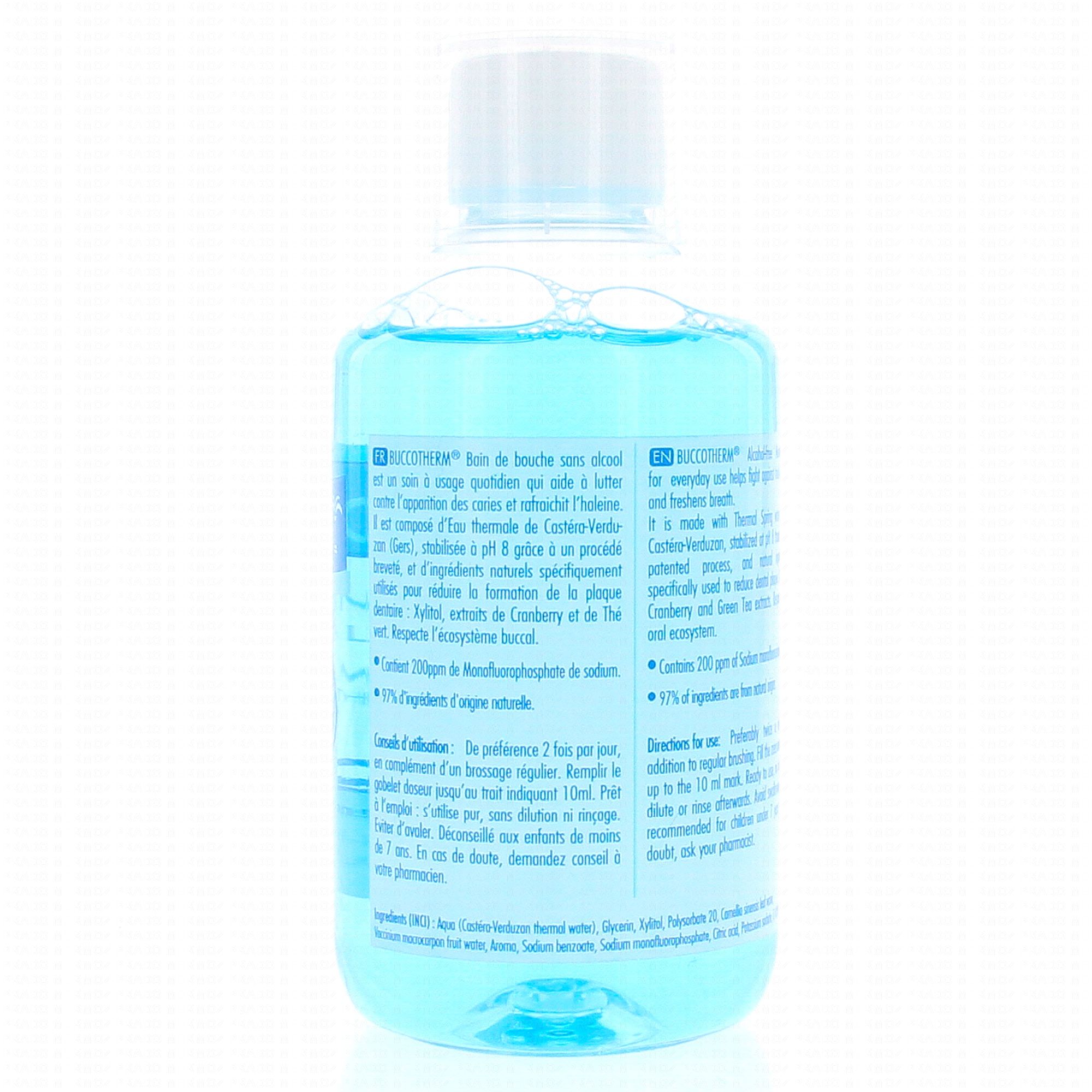Le bain de bouche goût menthe fraîche BUCCOTHERM rafraîchit l'haleine et aide à lutter contre la formation de plaque dentaire, tout en respectant l'écosystème buccal. Une habitude qui réunit plaisir et douceur grâce à son arôme de menthe adouci au Xylitol (un édulcorant naturel). Douce et efficace, sa formule composée à 97 % d'ingrédients d'origine naturelle et concentrée en Eau thermale de Castéra-Verduzan aux propriétés apaisantes et reminéralisantes convient, au quotidien, aux bouches les plus sensibles. Enrichi en fluor, en hydrolat de thé vert et en eau distillée de cranberry, il contribue à prévenir les attaques acides. Un geste d'hygiène, sans ingrédients controversés, à adopter deux fois par jour, après le brossage. À noter qu'il est déconseillé de l'avaler et de l'employer chez les enfants de moins de 7 ans. En cas de doute, demandez conseil à votre pharmacien.