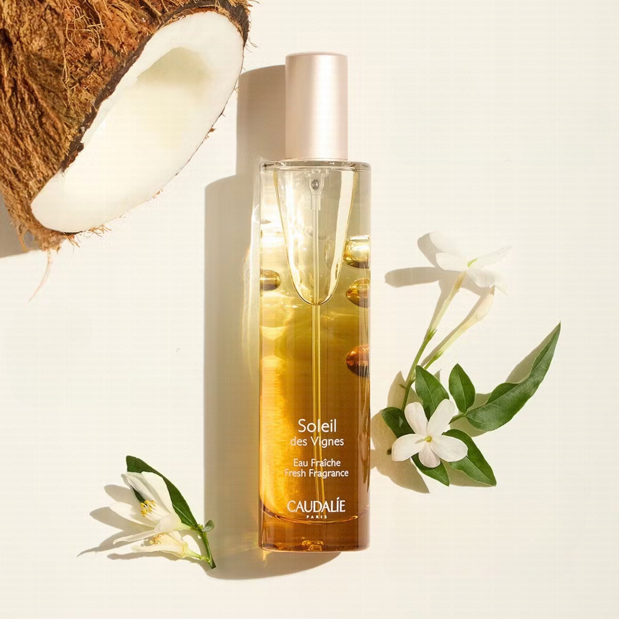 L'Eau Fraîche Soleil des Vignes est une eau parfumée, particulièrement chaleureuse. Sa fragrance ensoleillée révèle sur la peau des notes de coco, fleur d'oranger, jasmin et vanille… Une réminiscence de l'été tout au long de l'année.