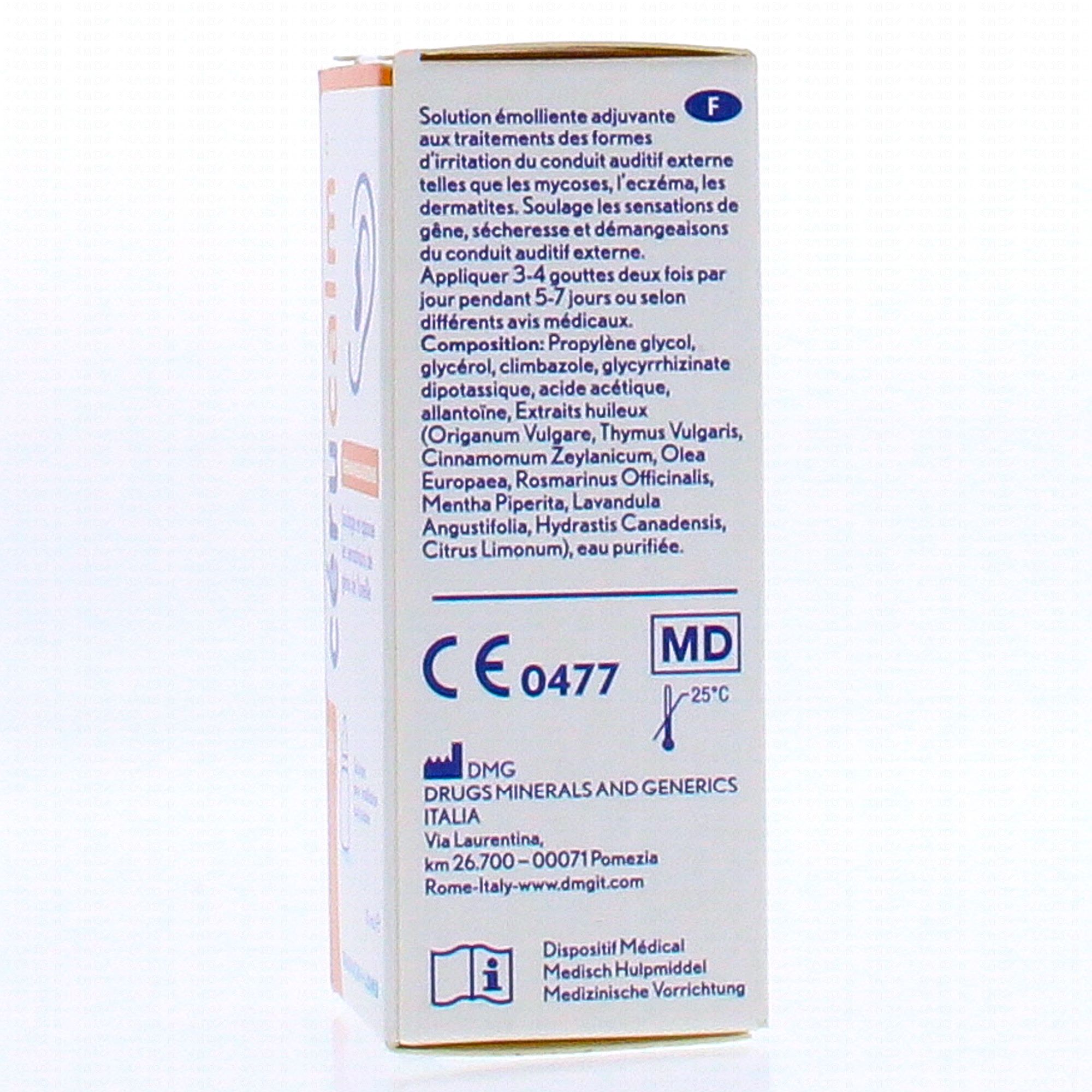 Cette solution auriculaire est émolliente et adjuvante pour les traitements des formes d'irritations du conduit auditif externe telles que les mycoses, l'eczéma, les dermatites.