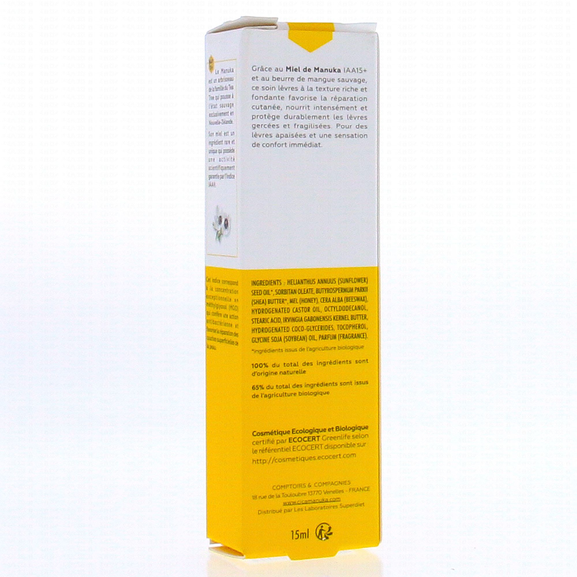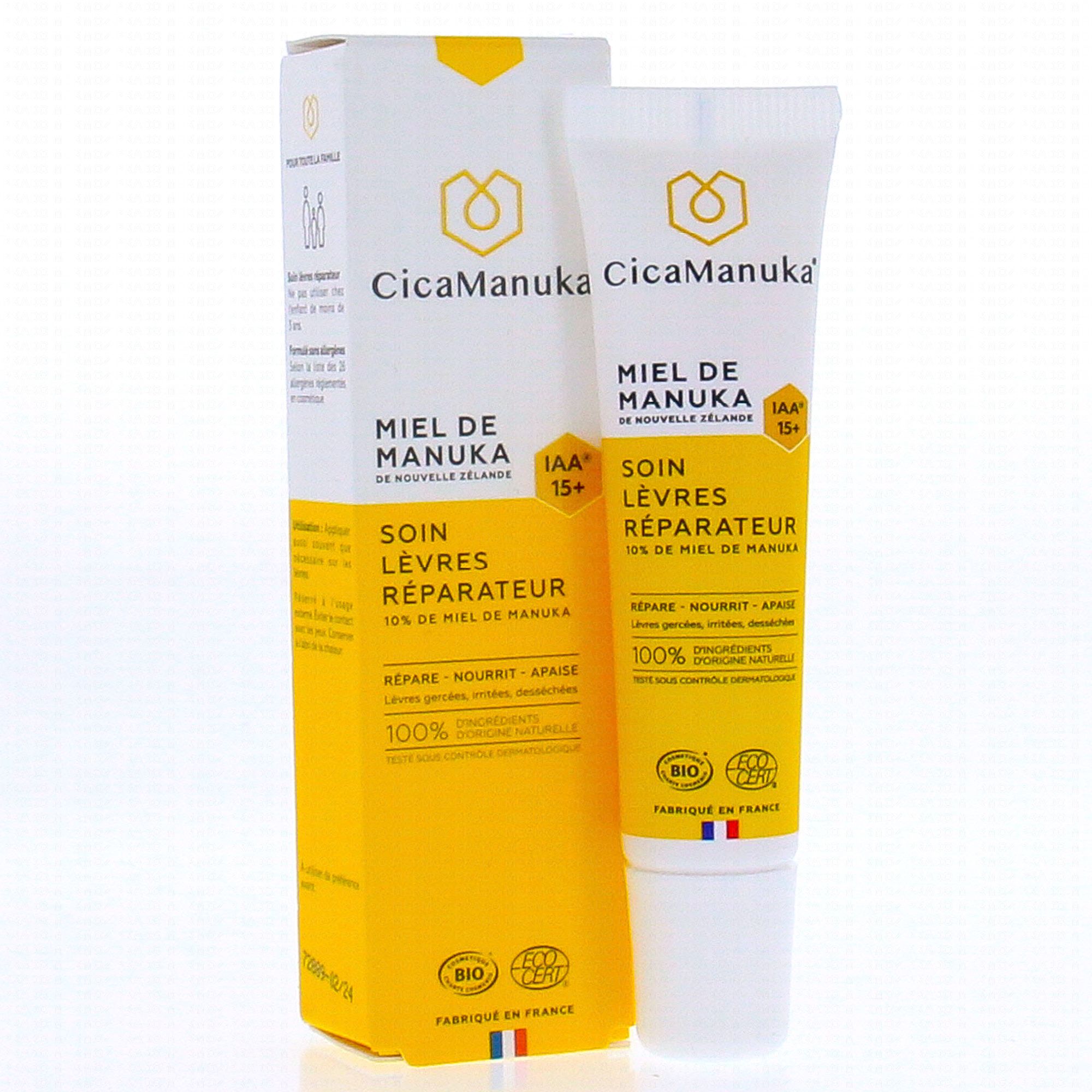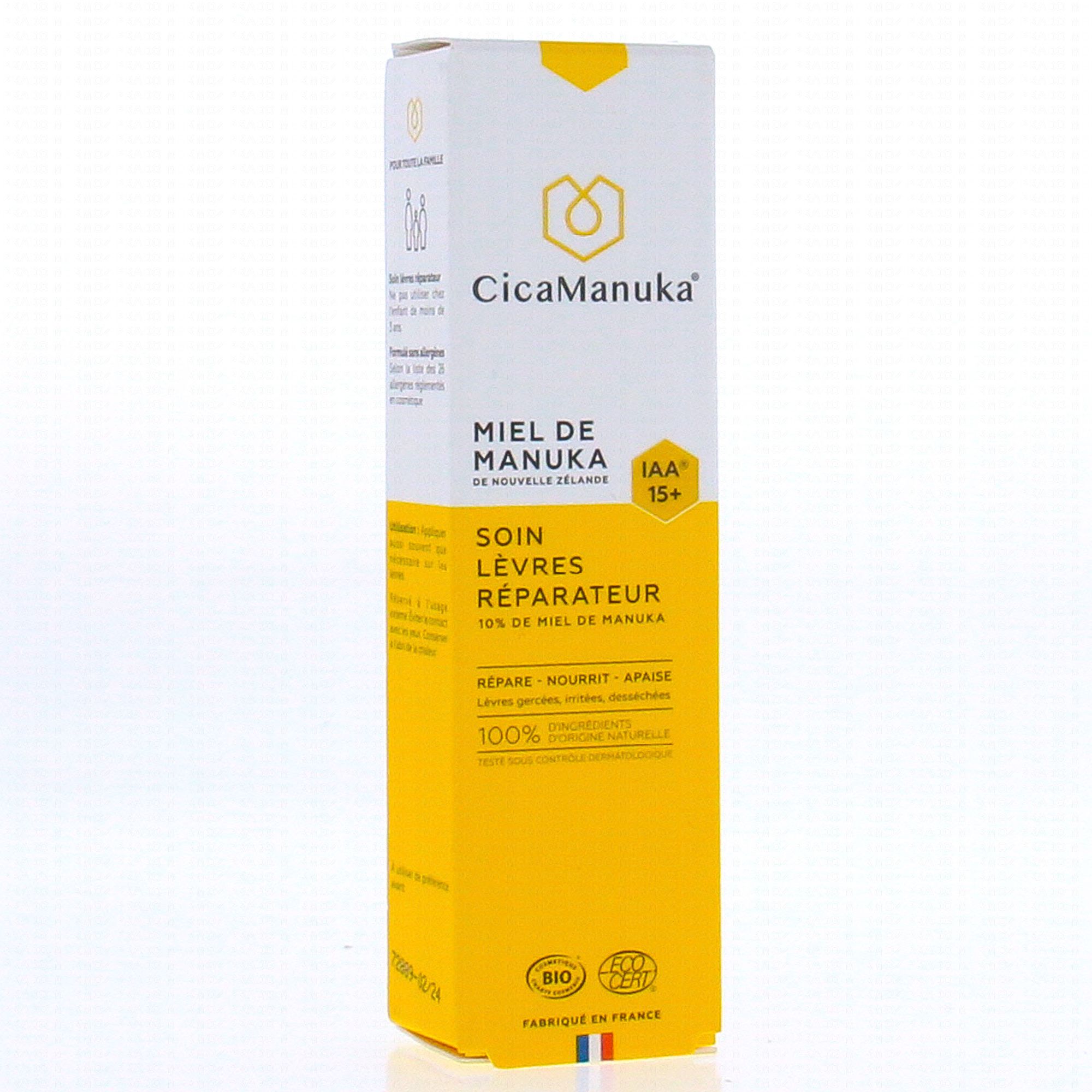 CicaManuka Soin Lèvres Réparateur 10% de Miel de Manuka IAA 15+ Bio 15 ml est un soin spécialement élaboré pour les lèvres gercées, irritées, desséchées.