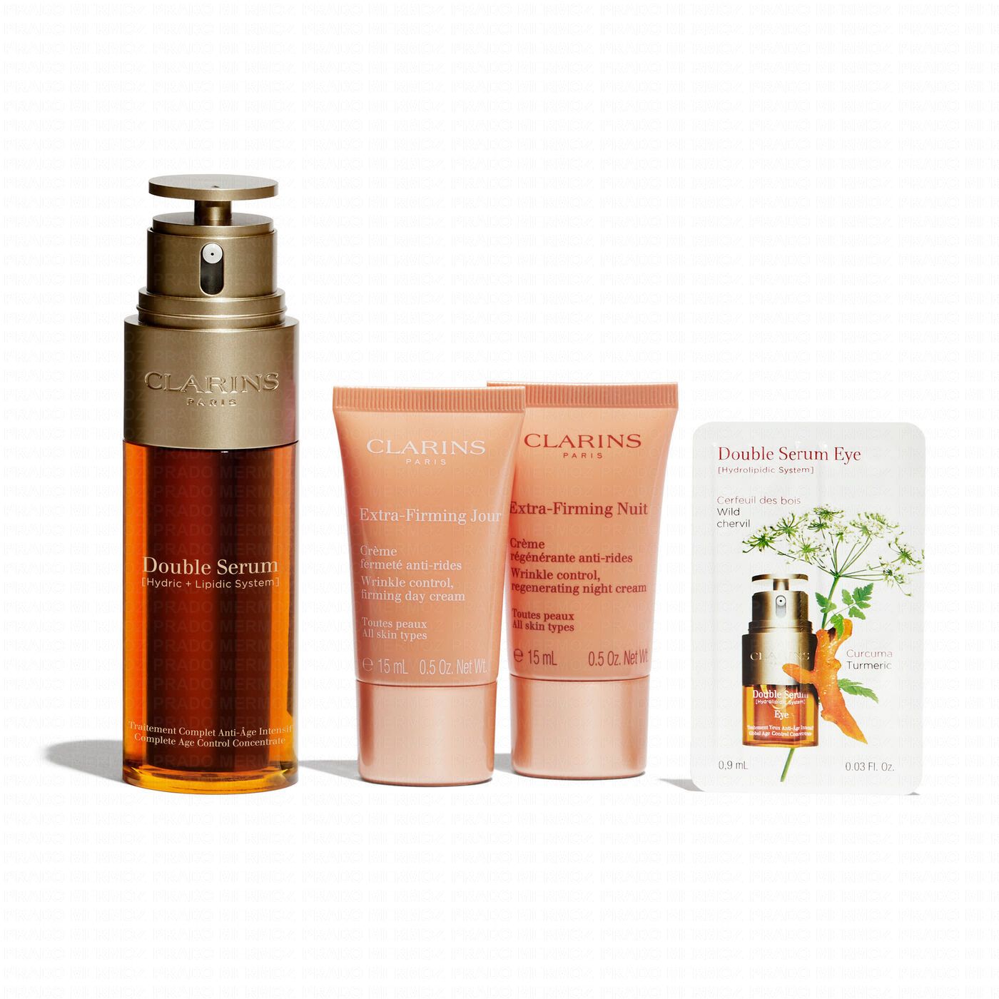 Ce coffret contient :- 1 Double Sérum 50 ml + échantillon double sérum yeux 0.9 ml.- 1 Extra Firming Nuit 15 ml.- 1 Extra-Firming Jour 15 ml.