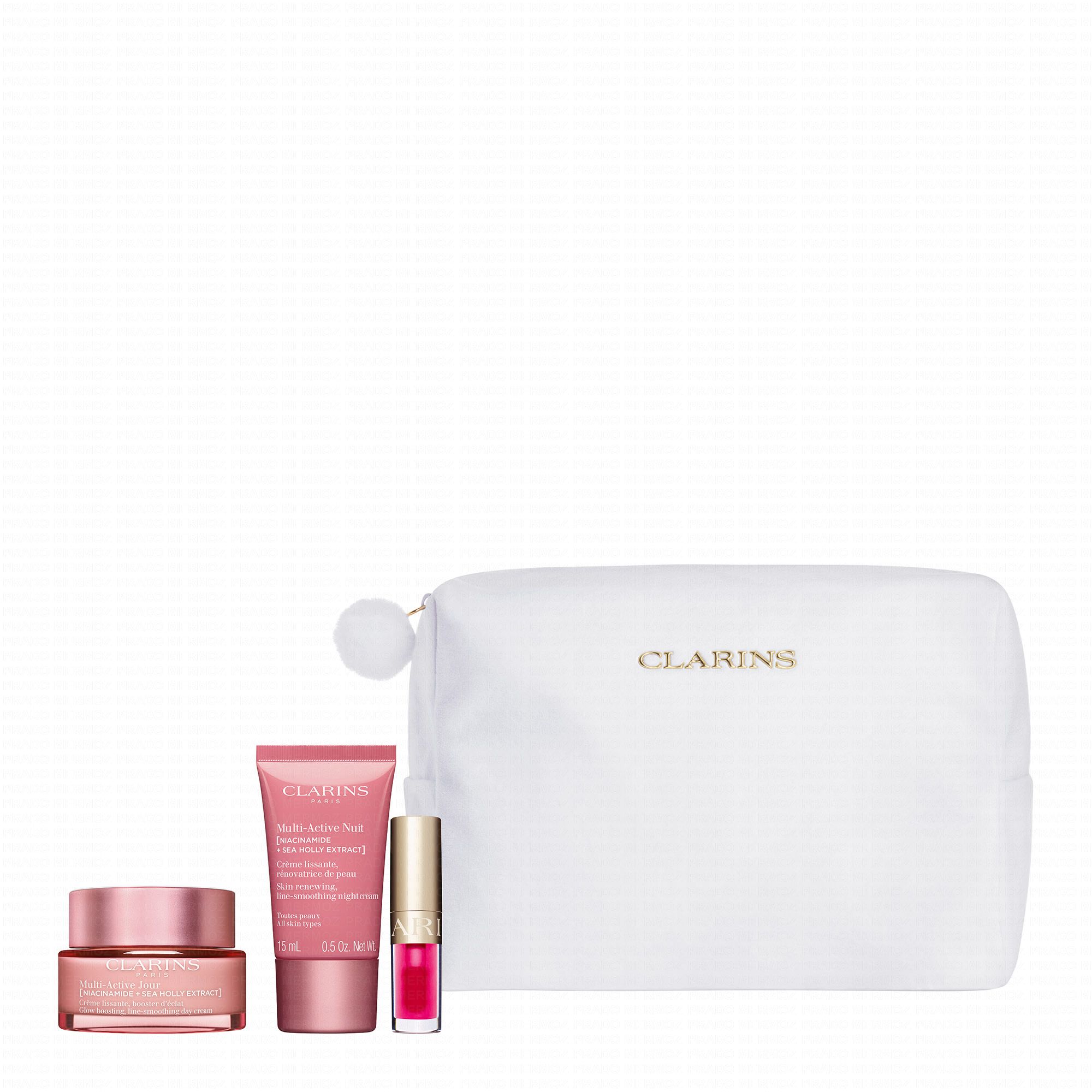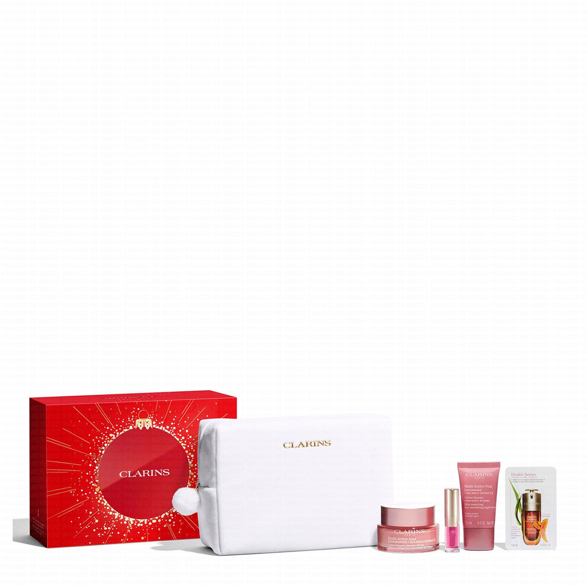 Ce coffret contient : - 1 Multi-Active Jour Toutes Peaux 50 ml- 1 Multi-Active Nuit Toutes Peaux 15 ml- 1 Lip Comfort 04 Pitaya 1.4 ml- 1 Double Sérum 0.9 ml- 1 Trousse