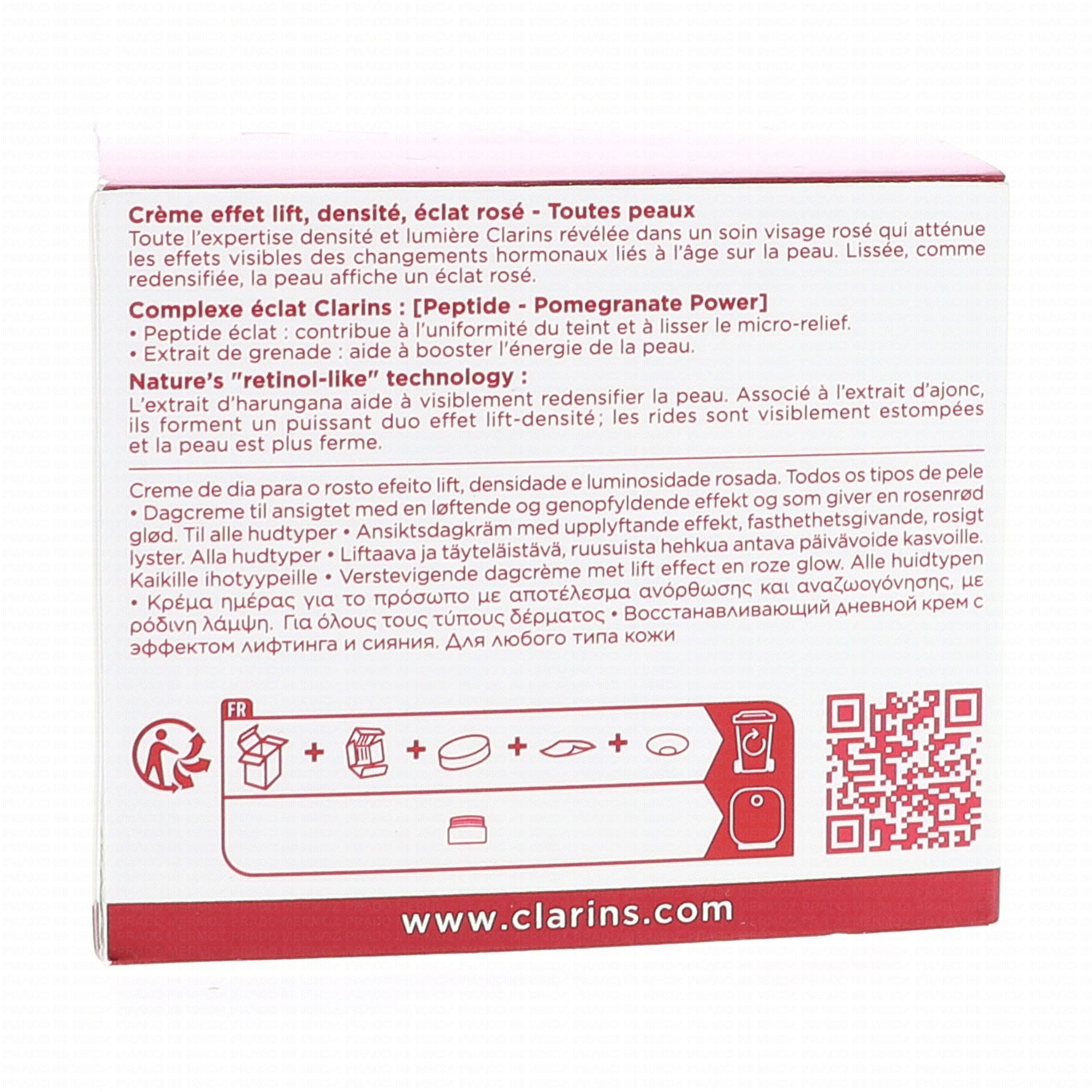 Les années passent et votre visage reste animé d'un bel éclat rosé. Toute l'expertise densité et lumière Clarins révélée dans ce soin de jour éveilleur de teint qui aide à redonner vie et matière aux peaux matures. Embellit la peau en réveillant son éclat rosé naturel. Au cœur d'une texture crème rose onctueuse, l'association unique d'acides de fleur d'hibiscus exfoliants pour dégriser le teint et affiner le grain de peau, de nacres illuminatrices et d'un extrait d'harungana bio redensifiant.