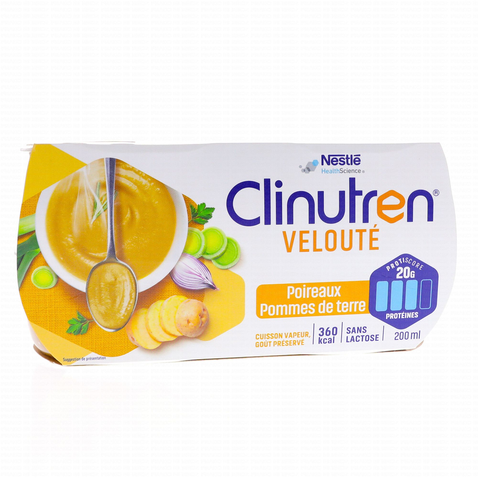 CLINUTREN Velouté Poireaux, Pommes de terre 4x200ml est une préparation hyperprotéinée et hypercalorique destinée aux personnes souffrants de dénutrition ou en voie de dénutrition. Chaque portion apporte 20 grammes de protéines et 360kcal.
