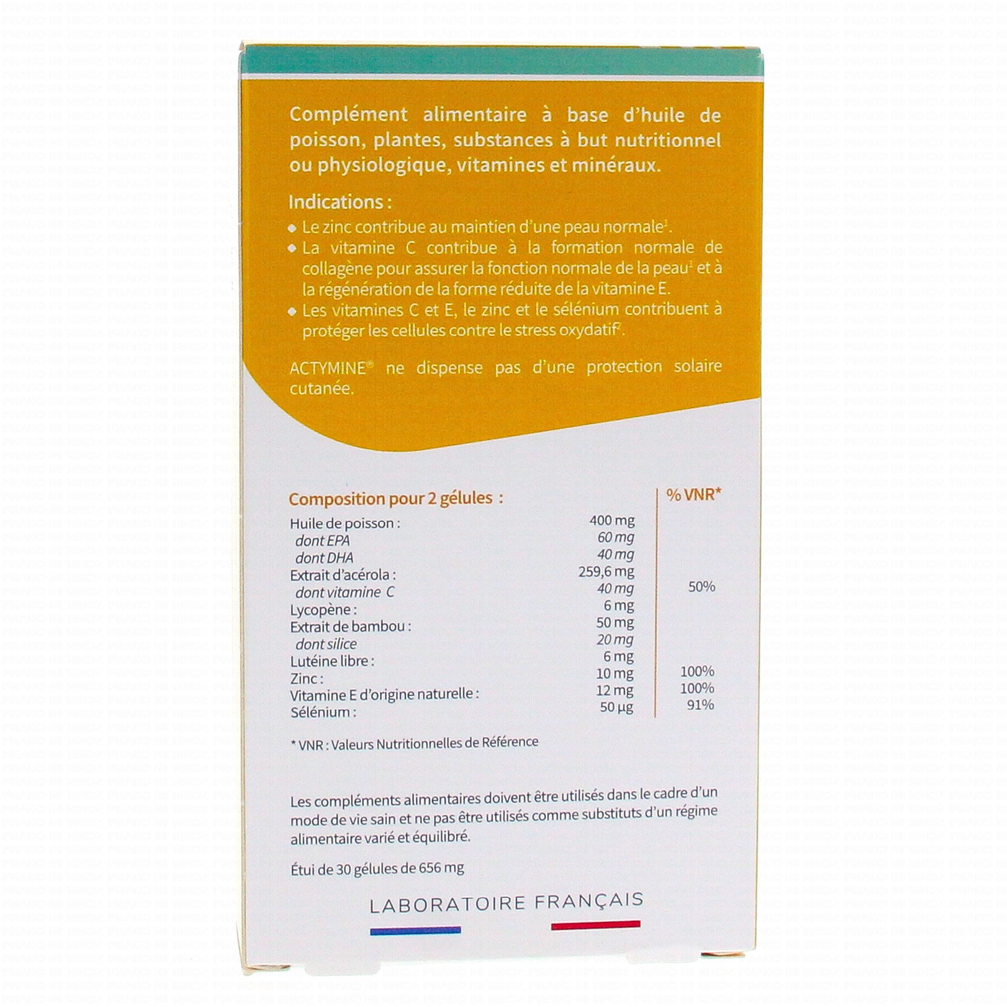 Huile de poisson: dont EPA: 60mg et DHA: 40mg, gélatine de peau de poisson, extrait sec d'acérola: 260mg dont vitamine C: 40 mg (soit 50% des AJR*), glycérol, hydrolysât de protéines de riz: 76,58 mg et sulfate de Zn, lycopène: 4 mg, triglycérides à chaîne moyenne, vitamine E naturelle d'origine végétale:12 mg (soit 100% des AJR*), eau, huile végétale non hydrogénée, Extrait de tiges de bambou (40mg) dont Silice: 20mg, cire jaune d'abeille, colorant naturel caramel, lécithine de soja, vitamine E naturelle: 12 mg (soit 100% des AJR*), Lutéine libre: 4mg, Zinc (HYPRO-RI®: 10 mg (soit100% des AJR*) et Manganèse (HYPRO-RI®) 2 mg ( soit 100 des AJR*, Sélénium (HYPRO-RI®) 50 µg (soit 91% des AJR*)anthocyanes naturels 1,25 mg et lycopène 2 mg, excipients qsp deux gélules