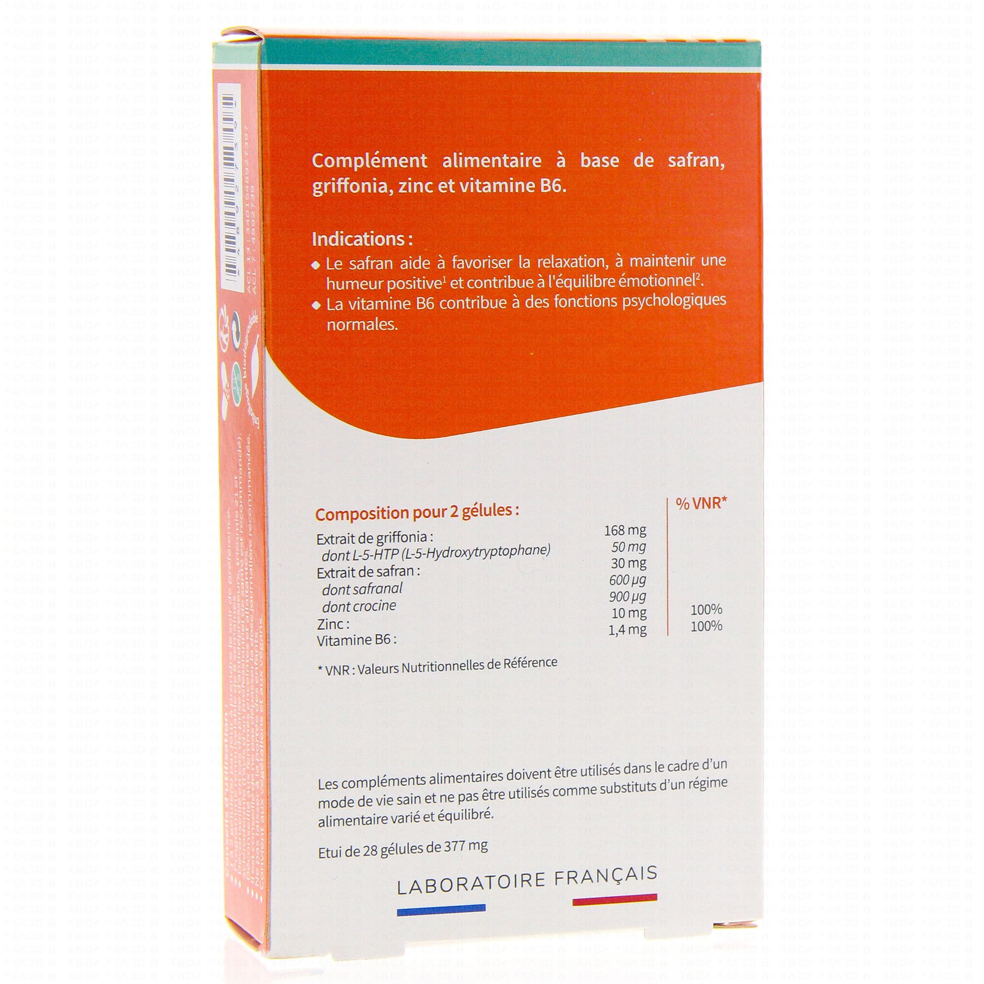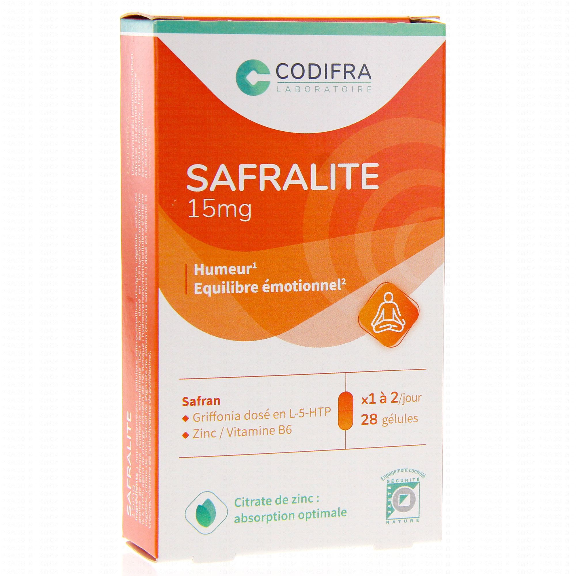 Pour 2 Gélules de Safralite 15 mg: agent de charge maltodextrine, extrait de griffonia simplicifolia 168 mg dont 5-HTP soit 50,40mg, tunique végétale HPMC, hydrolysat de protéines de riz et sulfate de Zinc soit Zinc (HYPRO-RI®): 10 mg (soit 100% des AJR*), extrait de stigmate de safran 30 mg dont safranal soit 600 µg, agent de charge silice, agent d'enrobage huile de palme, antiagglomérants stéarate de Mg et silice colloïdale anhydre, vitamine B6: 1,4 mg (Soit 100% des AJR*), excipients