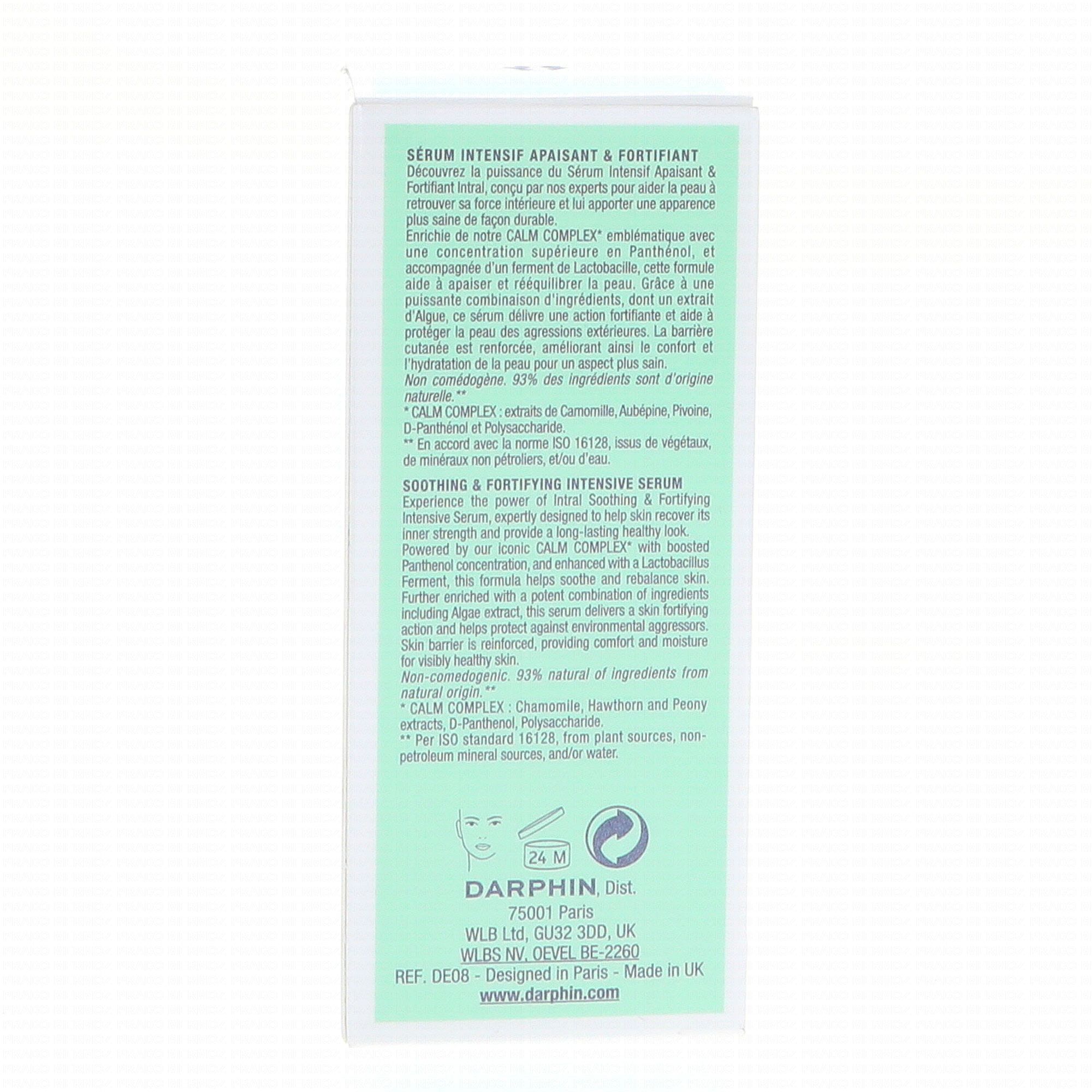 Darphin Intral Sérum Intensif Apaisant et Fortifiant 30 ml est un sérum enrichi du Calm Complex® (extraits de camomille, aubépine, pivoine, d-panthénol et polysaccharide), avec une concentration supérieure en panthénol, et accompagné d'un ferment de lactobacille, pour aider à apaiser et rééquilibrer la peau.