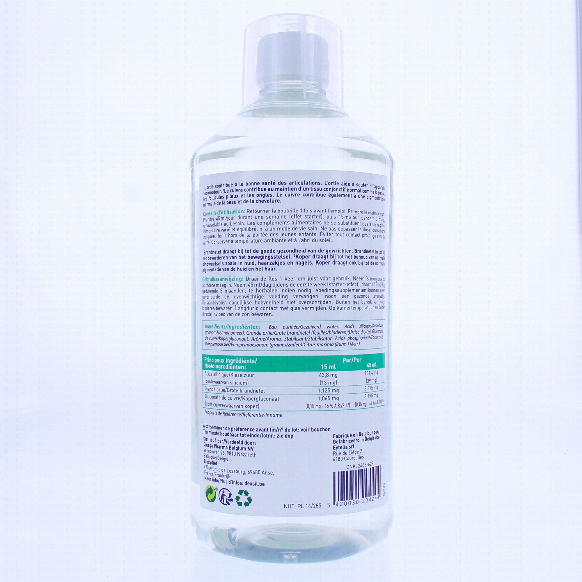 Eau purifiée, acide silicique (monomère), grande ortie (feuilles) (Urtica dioica), gluconate de cuivre, arôme, stabilisant : acide phosphorique pamplemoussier (graines)/ (Citrus maxima Burm.) Merr.)