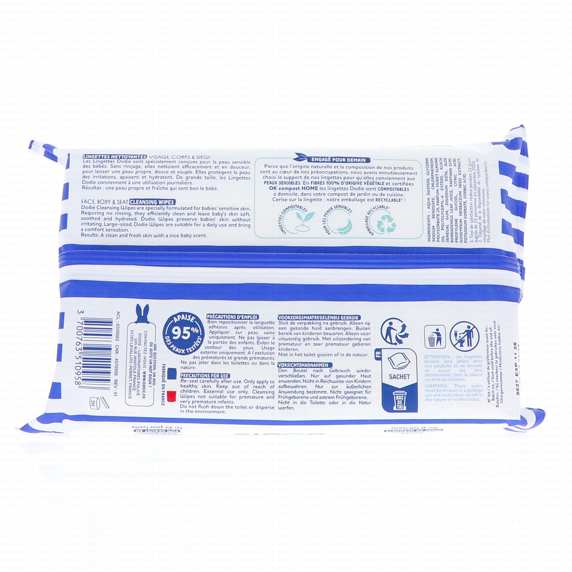 Lingettes nettoyante siège, visage et mains ultra-douces pour bébé. Sans paraben, sans alcool, sans phénoxyéthanol. Les lingettes Dodie sont hypoallergéniques pour une toilette en douceur tout en respectant la peau sensible de bébé.