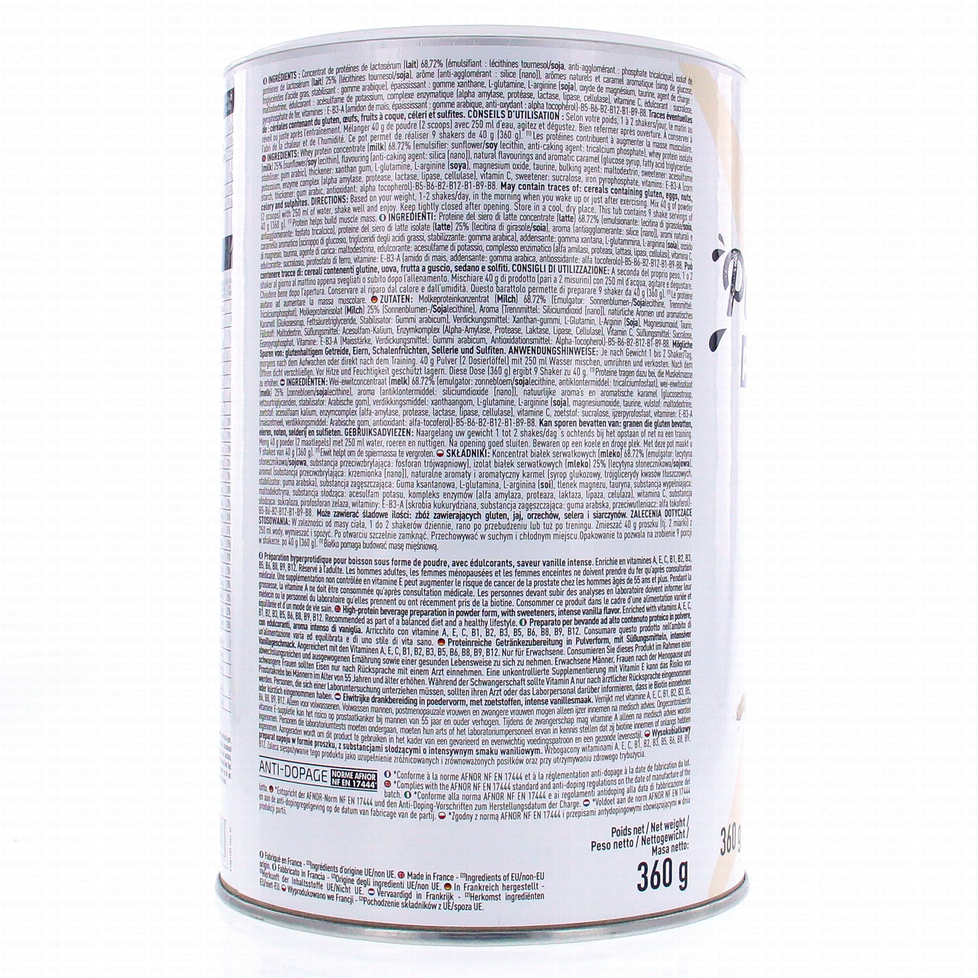 Concentrat de protéines de lactosérum 42,7% (émulsifiants : lécithine de tournesol, phosphate tricalcique) (lait), isolat de protéines de lactosérum 41% (émulsifiant : lécithine de tournesol) (lait), hydrolysat de protéines de lactosérum 10% (lait), arômes (antiagglomérant : E551 [nano], stabilisant : gomme arabique), épaississant : gomme xanthane, l-glutamine, l-arginine, minéraux : oxyde de magnésium - pyrophosphate de fer, édulcorants : acésulfame de potassium - sucralose, taurine, vitamines : C-E-PP-A (antioxydant : dl-alpha-tocophérol)-B5- B6-B2-B1-B12-B9-B8, complexe enzymatique (alpha amylase - protéase - lactase - lipase - cellulase), maltodextrines.