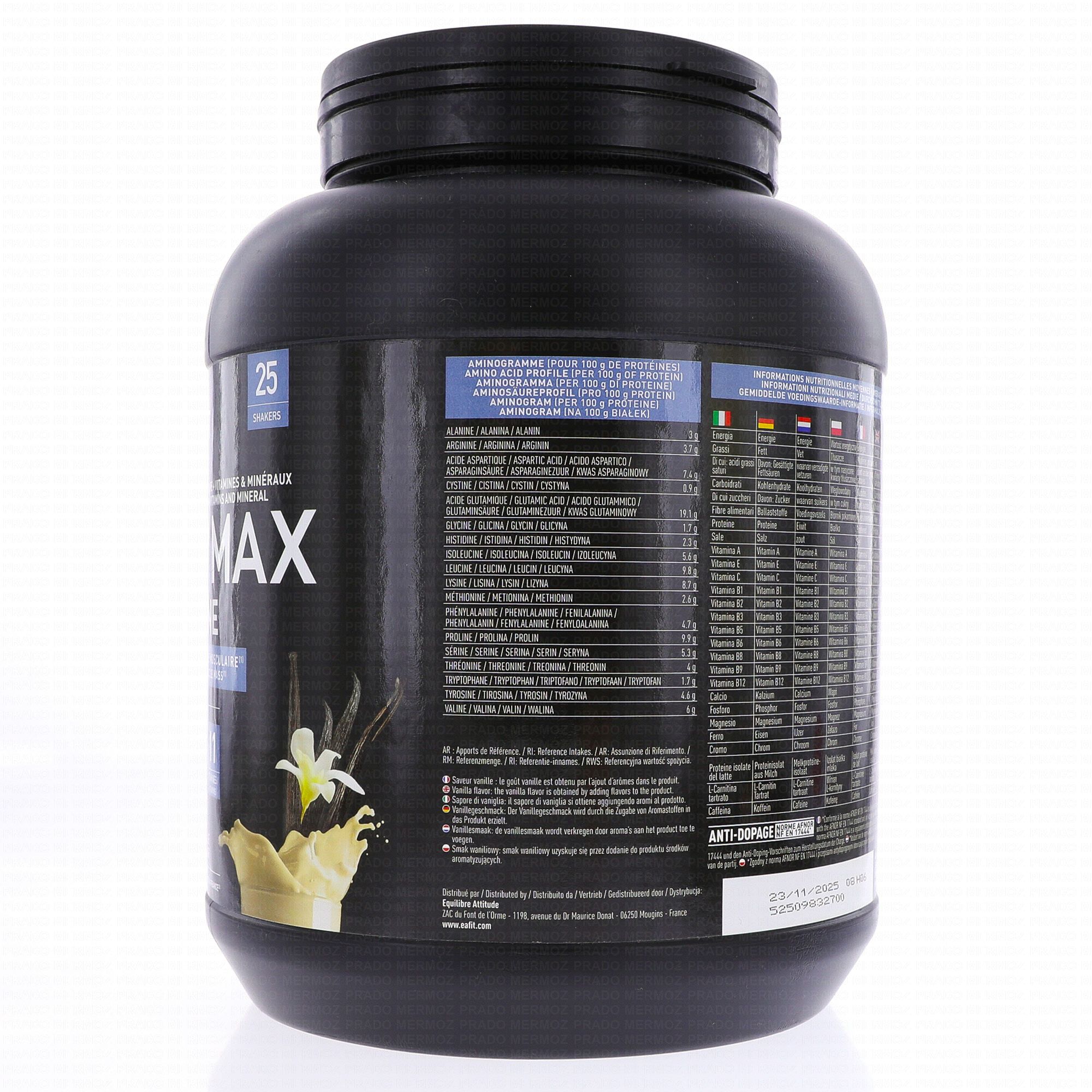 Préparation hyperprotidique pour boisson sous forme de poudre avec édulcorants - saveur vanille. Contient de la caféine, déconseillé aux enfants et aux femmes enceintes ou allaitantes. (Teneur en caféine : 20 mg/100 ml de boisson reconstituée).