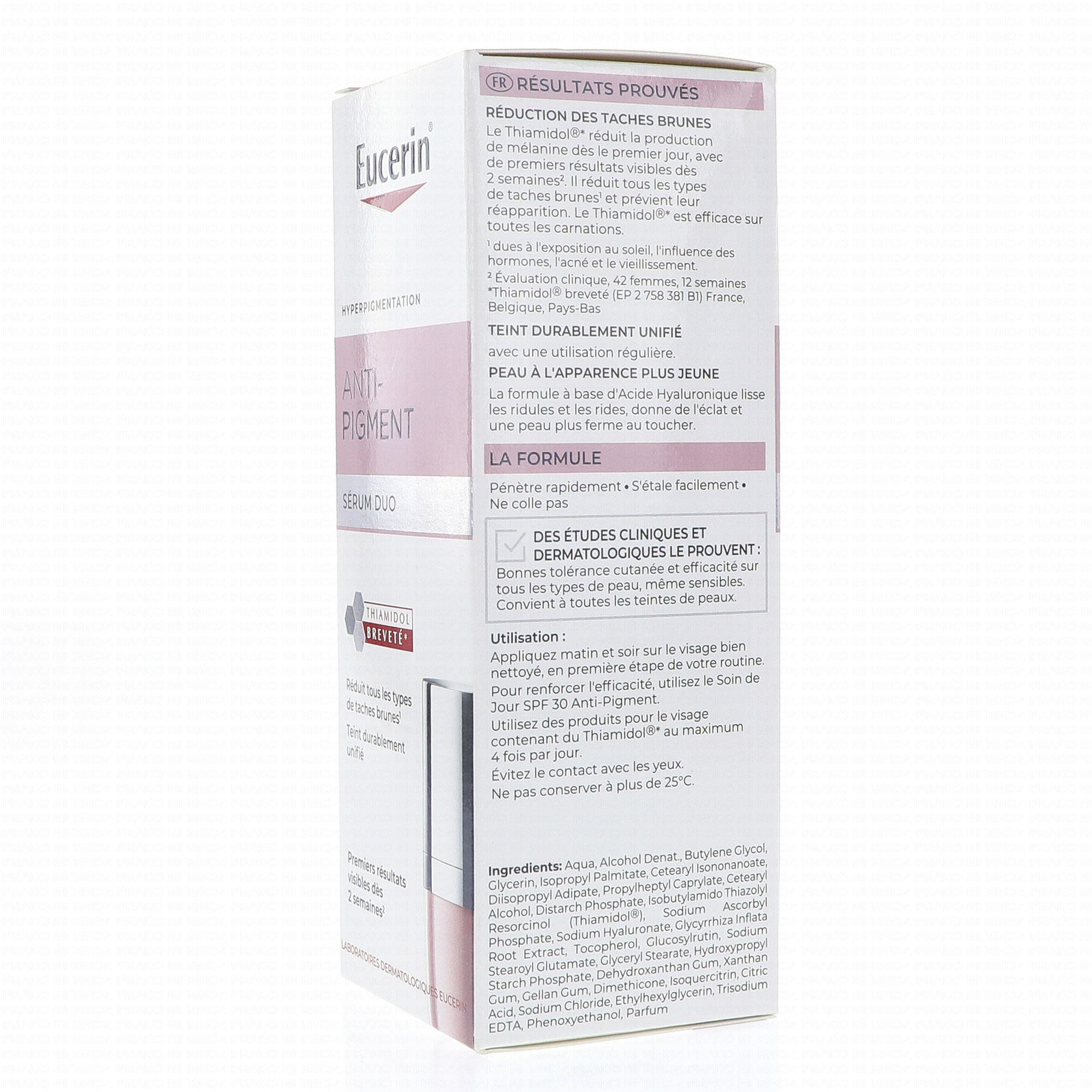 Pour de meilleurs résultats, utilisez ce sérum en association avec Eucerin Anti-Pigment Soin de Jour SPF 30, Eucerin Anti-Pigment Soin de Nuit et Eucerin Anti-Pigment Correcteur de Taches.