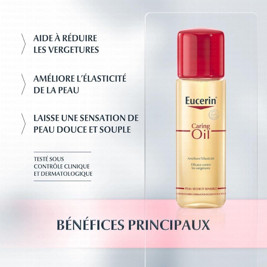 Chaque jour, votre peau est soumise à de nombreux facteurs de stress. Cela peut être dû à une grossesse, une croissance trop rapide à la puberté, une prise de poids importante et rapide... Ces grands changements peuvent contribuer à l'apparition de vergetures dans la zone du ventre, de la poitrine ou des cuisses, entre autres. L'Huile anti-vergetures des Laboratoires Dermatologiques Eucerin a été spécialement élaborée pour réduire très efficacement les vergetures. Votre peau ainsi redynamisée retrouvera toute son élasticité et votre circulation sanguine sera stimulée.