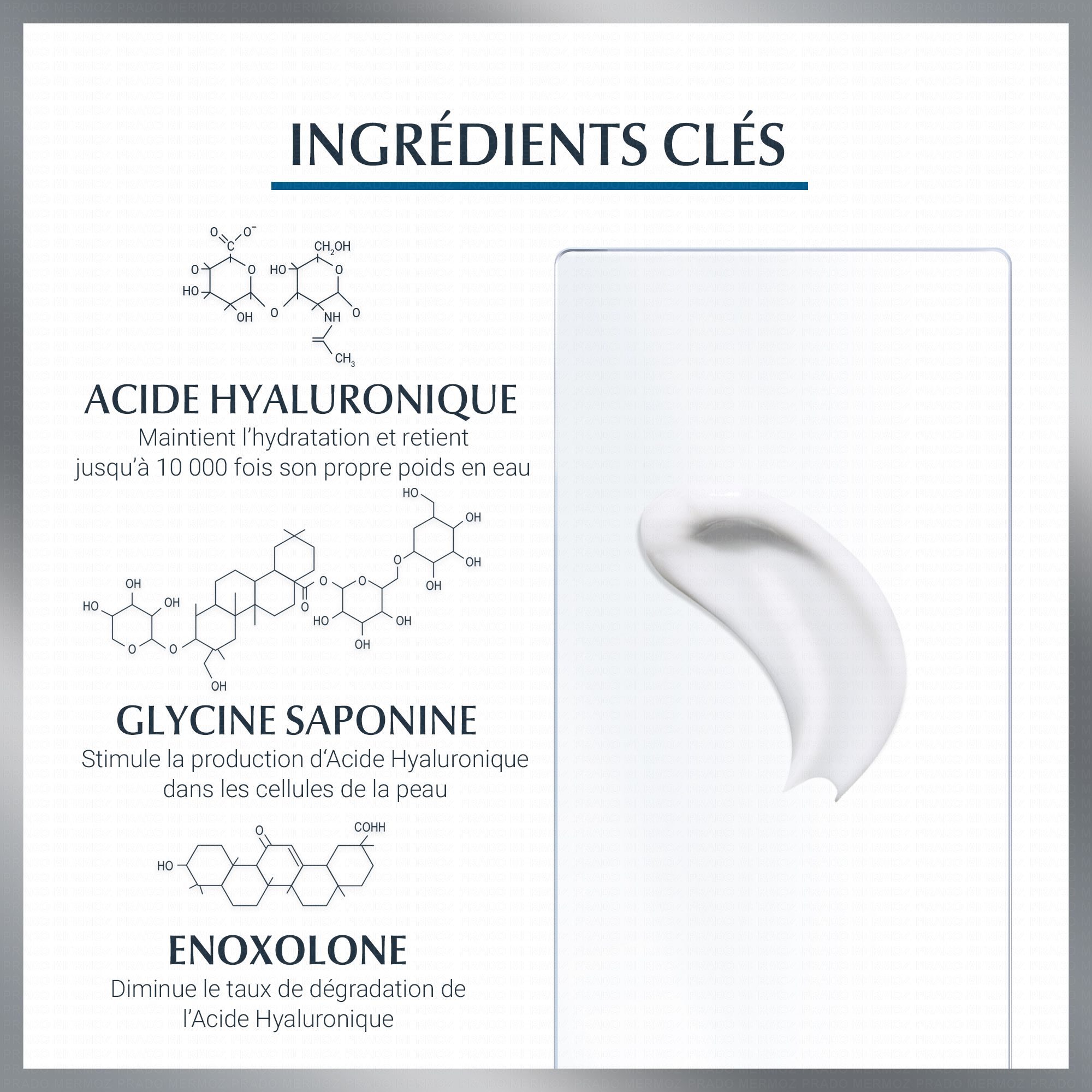 - Protège : l'Enoxolone diminue le taux de dégradation de l'Acide Hyaluronique.