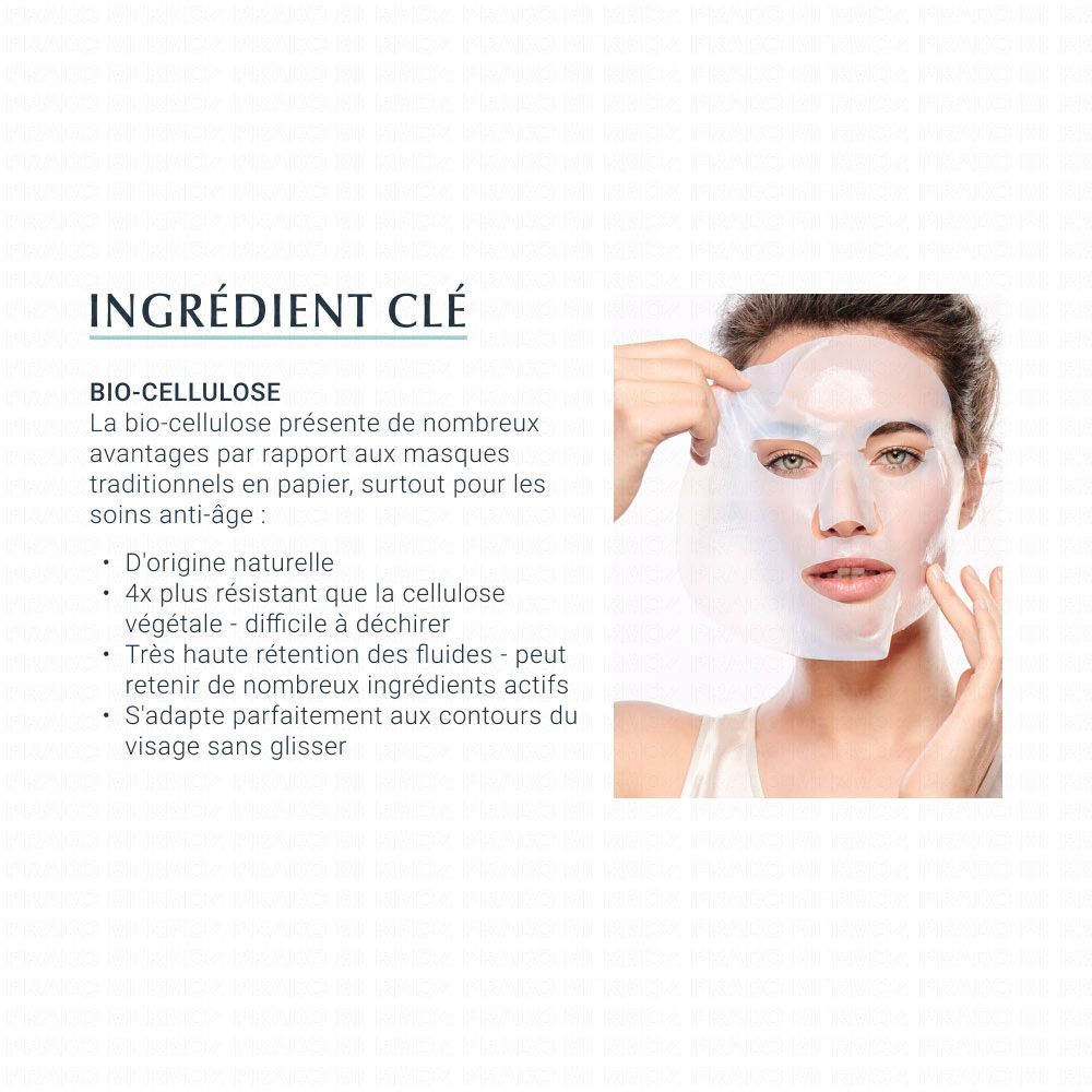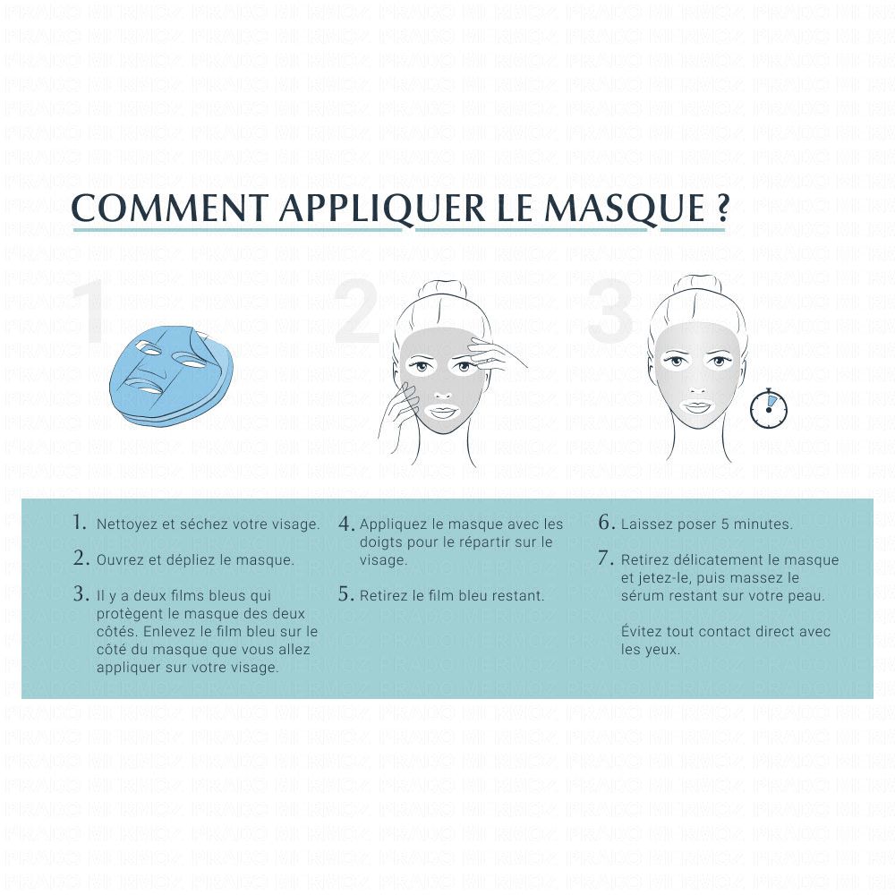 Appliquez une à deux fois par semaine, en complément de vos soins habituels ou à chaque fois que votre peau vous semble terne et fatiguée. Deux feuilles bleues protègent le masque des 2 côtés. Ouvrez et dépliez le masque. Retirez les 2 feuilles bleues de protection. Apliquez le masque sur un visage bien nettoyé et sec, en utilisant vos doigts pour le faire adhérer uniformément à votre visage et ajustez-le comme vous le souhaitez. Laissez agir 5 minutes puis retirez et jetez le masque. Massez délicatement tout excès de sérum sur la peau. Ne pas utiliser sur peau irritée ou lésée. Éviter tout contact avec les yeux.
