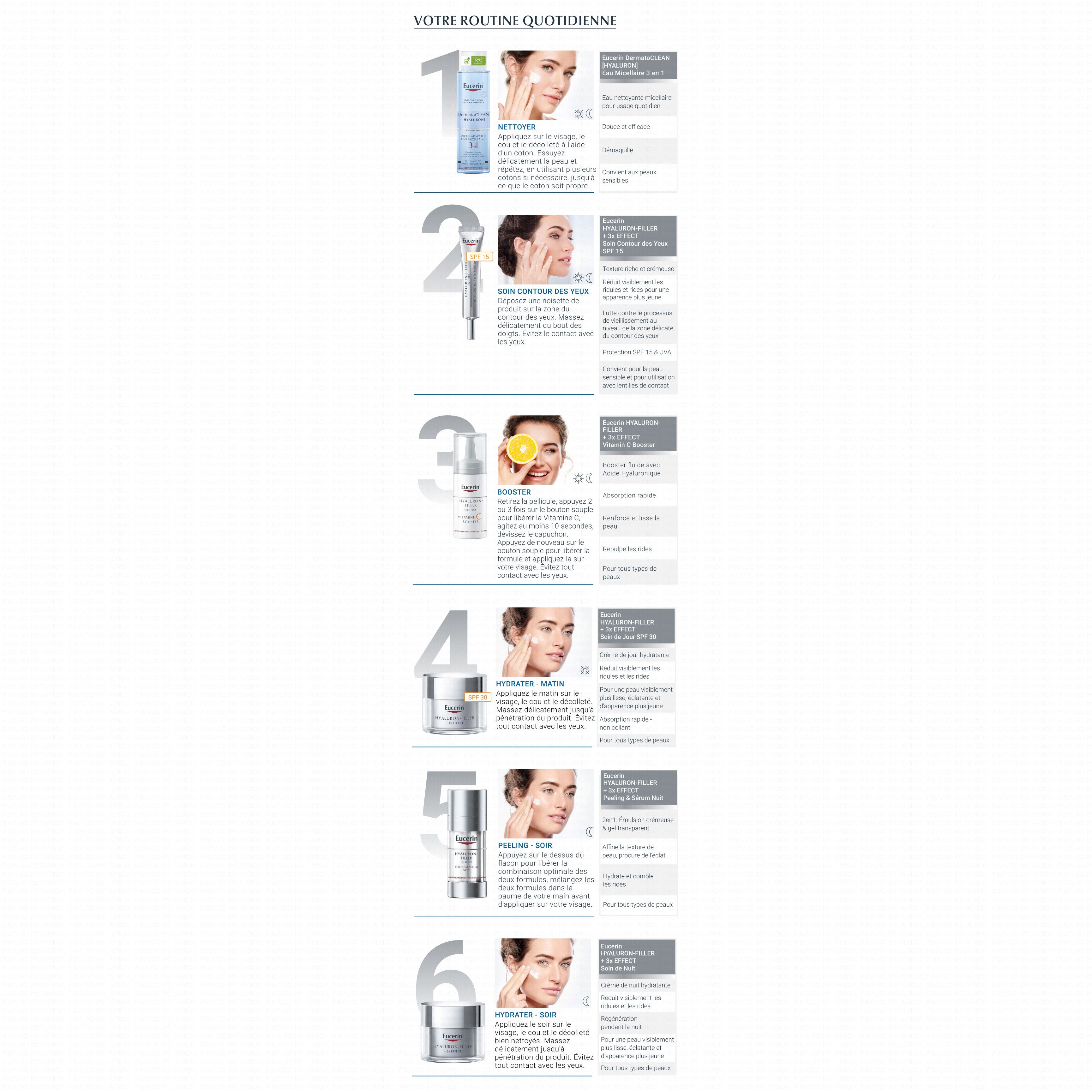 Les dermatologues utilisent les injections d'Acide Hyaluronique et les peelings pour rendre la peau plus jeune. En s'inspirant de ces traitements, Eucerin HYALURON-FILLER + 3x EFFECT PEELING & SÉRUM NUIT combine deux formules puissantes pour de multiples bénéfices anti-âge :