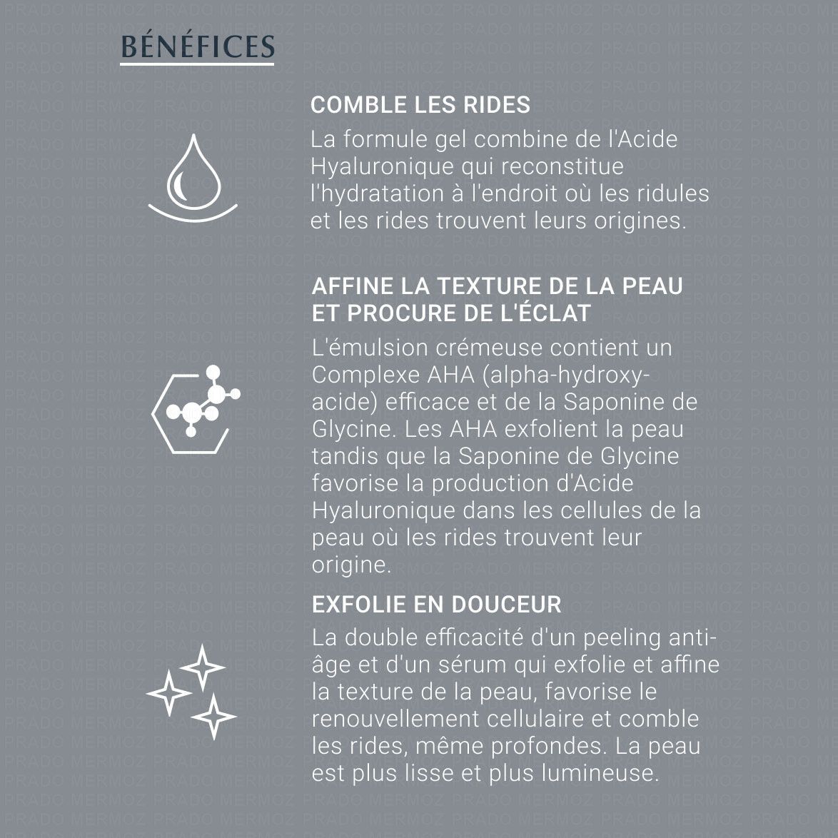 Hydratation et comblement des rides: Le gel transparent associe l'Acide Hyaluronique concentré de haut et de bas poids moléculaire. L'Acide Hyaluronique de haut poids moléculaire aide à lisser les couches supérieures de l'épiderme tandis que l'Acide Hyaluronique de bas poids moléculaire (qui est 40 fois plus petit) pénètre plus profondément dans les couches de l'épiderme où naissent les rides plus profondes.