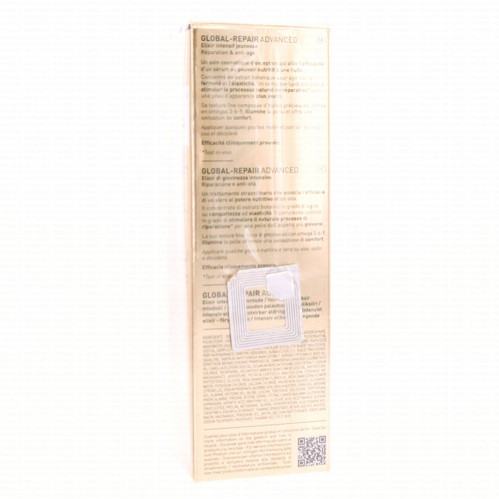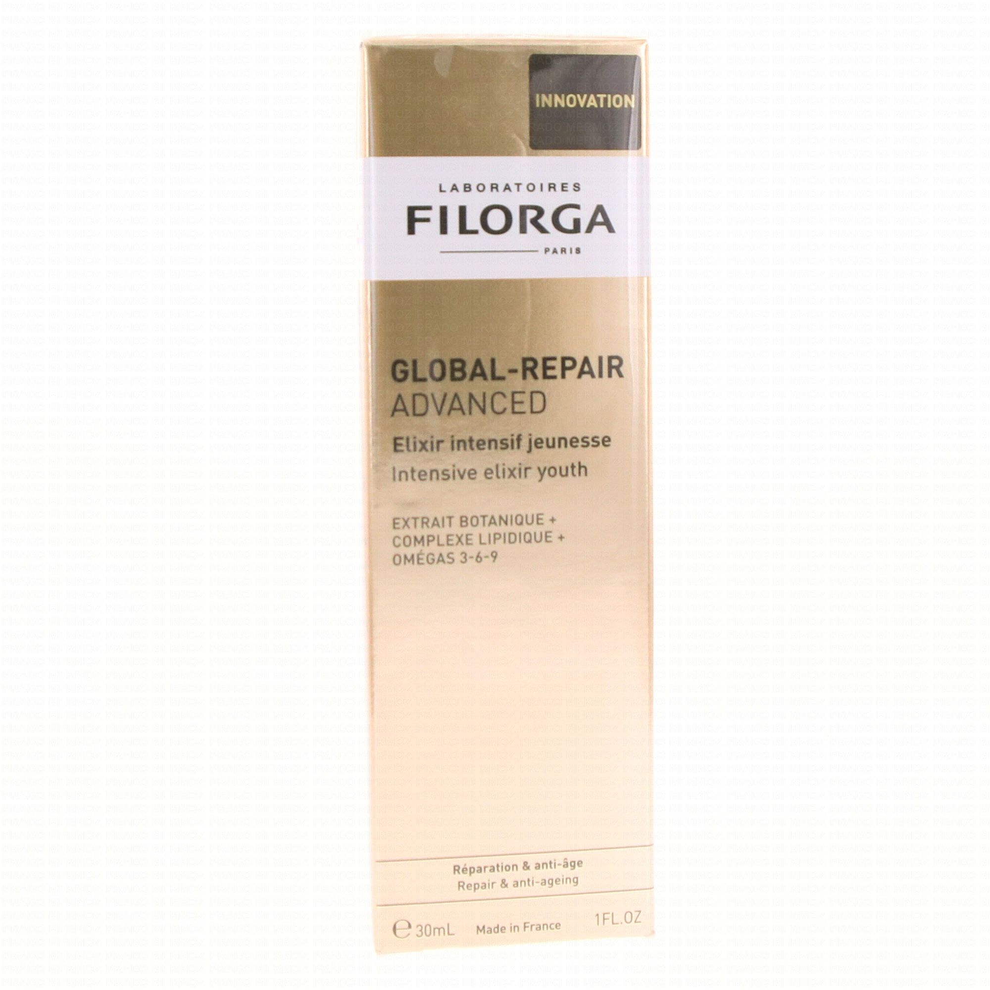 Filorga GLOBAL-REPAIR ADVANCED Elixir Intensif Jeunesse 30 ml est un soin qui agit sur les 10 signes de l'âge : rides, fermeté, homogénéité, éclat, microrelief, élasticité, nutrition, tonicité, densité, contour redéfini.