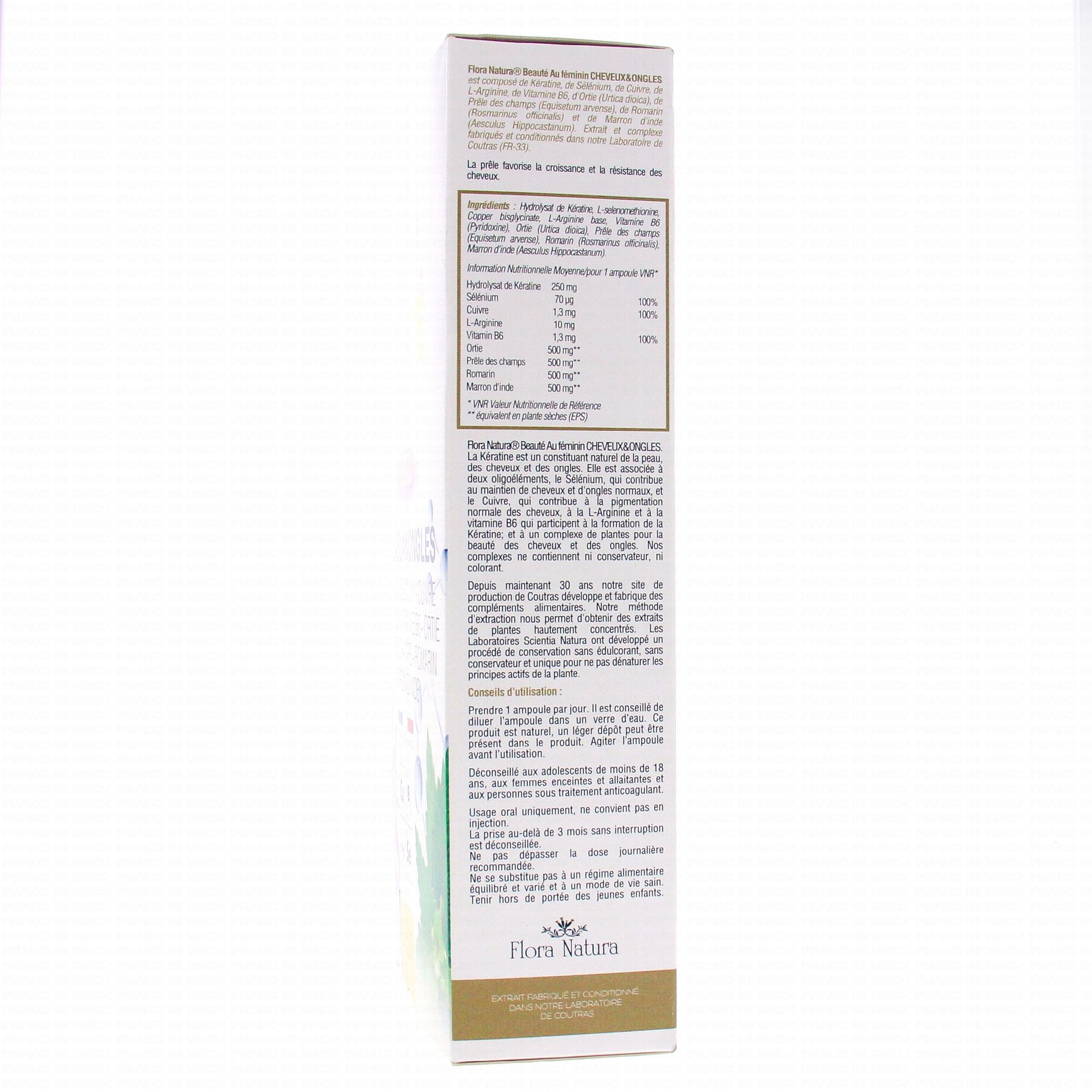 FLORA NATURA Beauté au féminin cheveux et ongles 20 ampoules est un complément alimentaire qui contribue à la santé de la peau et des ongles grâce à la présence de Prêle. L'Ortie joue un rôle dans le maintien de la santé de la peau. Le Romarin participe au maintien des fonctions physiologiques purificatrices. Le Cuivre favorise la pigmentation normale des cheveux. Le Sélénium aide à protéger les cellules du stress oxydatif. Le Marronier d'inde soutient d'activité physiologique des phanères.