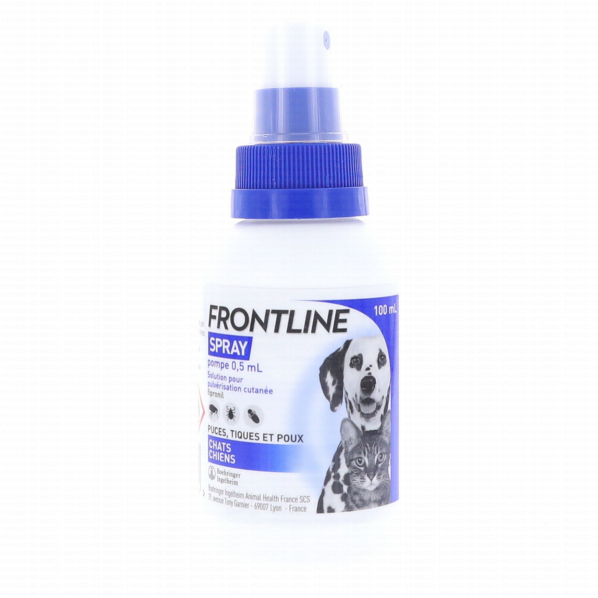 FRONTLINE spray agit en moins de 4 heures. C'est la solution idéale d'attaque lors d'infestation massive, pour traiter de très jeunes animaux (dès 2 jours) ou pour une solution économique pour traiter des animaux de poids différents. FRONTLINE Spray élimine les puces adultes et les tiques. Antipuce, antitique, antipoux. Durée d'efficacité chez le chien : contre les puces 60 à 90 jours, contre les tiques 30 jours environ. Durée d'efficacité chez le chat : contre les puces 40 jours environ, contre les tiques 2 semaines. Conditionnement : flacon pompe doseuse délivrant 0,5 ml par pulvérisation. Péremption : 2 ans. Usage vétérinaire.