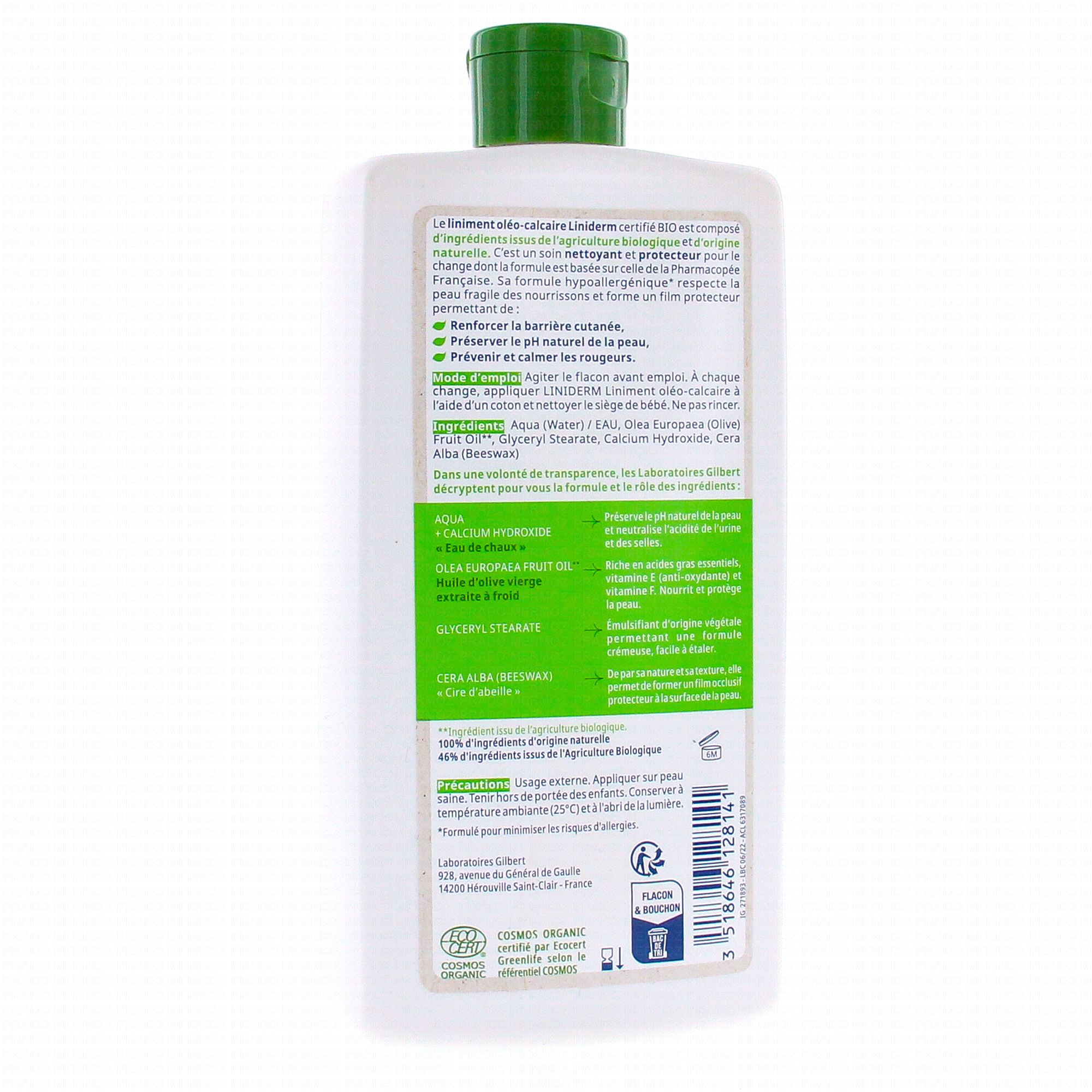 Gilbert Liniderm Liniment Oléo-Calcaire Bio 250 ml est un soin nettoyant et protecteur pour le change, basé sur la formule de la Pharmacopée Française. Sa formule riche en huile d'olive vierge respecte la peau fragile des nourrissons. Il forme un film protecteur permettant de :