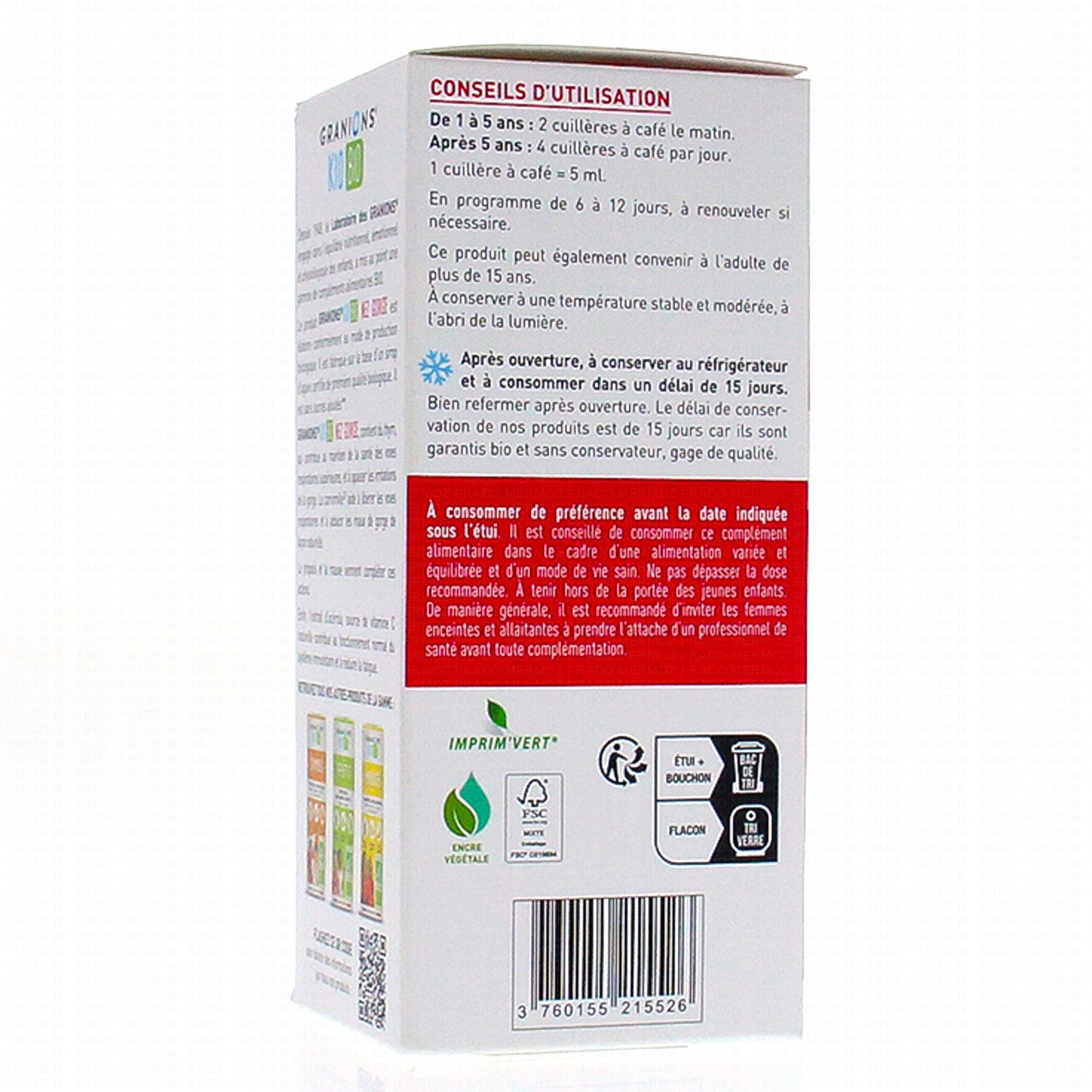 GRANIONS KID Nez Gorge Flacon 125ml est un complément alimentaire qui contribue à soulage l'inconfort de la gorge grâce à la présence de Propolis. Le Mauve et la Camomille soutiennent le confort respiratoire. L'Acérola aide à renforcer le système immunitaire et à réduire la fatigue.
