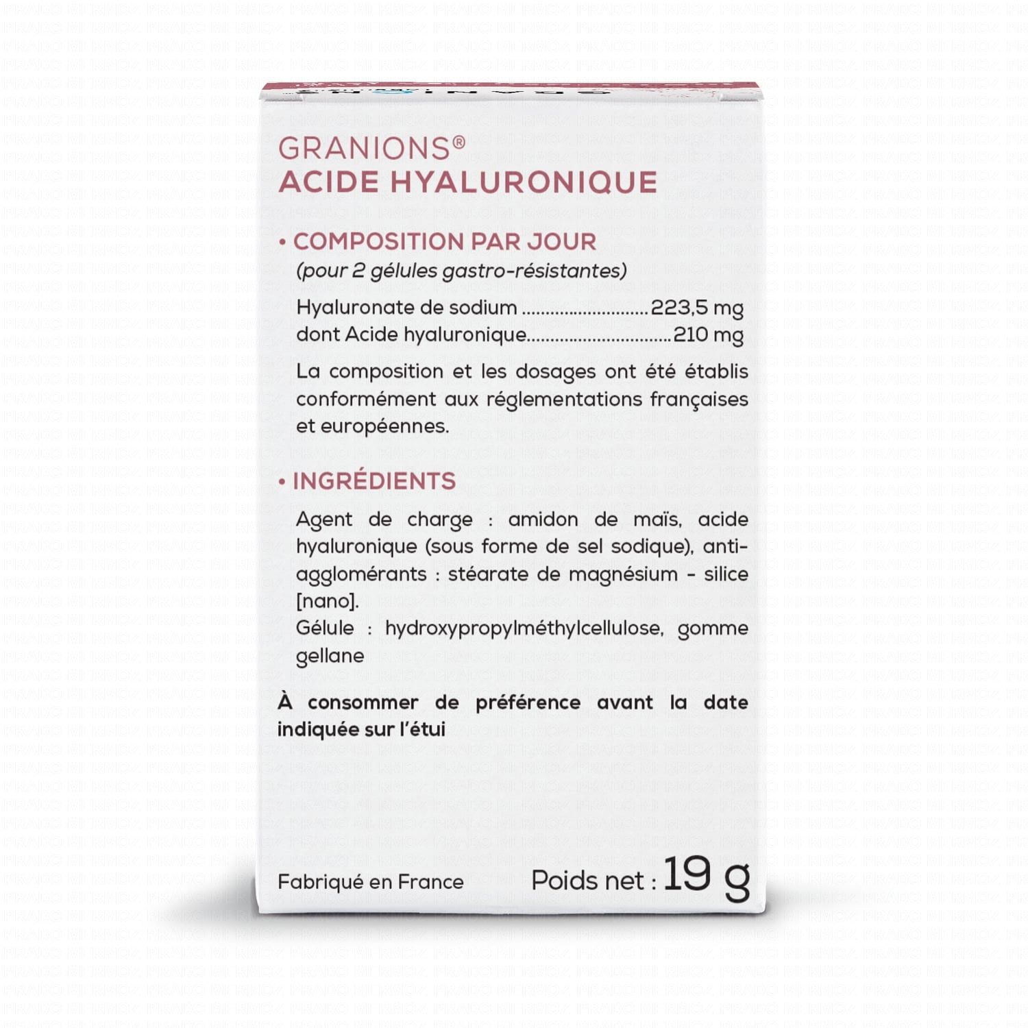 EA PHARMA Granions acide hyaluronique boite de 60 gélules contient les éléments suivants :
