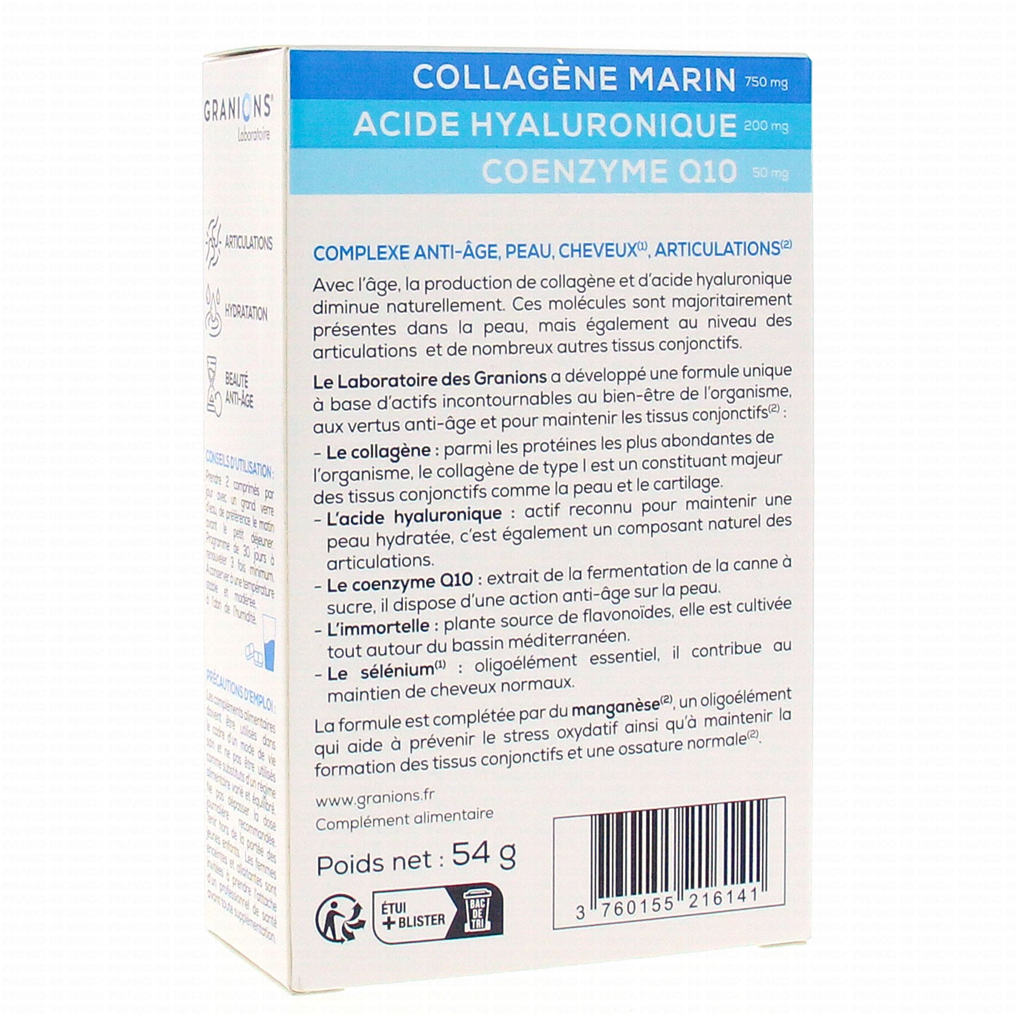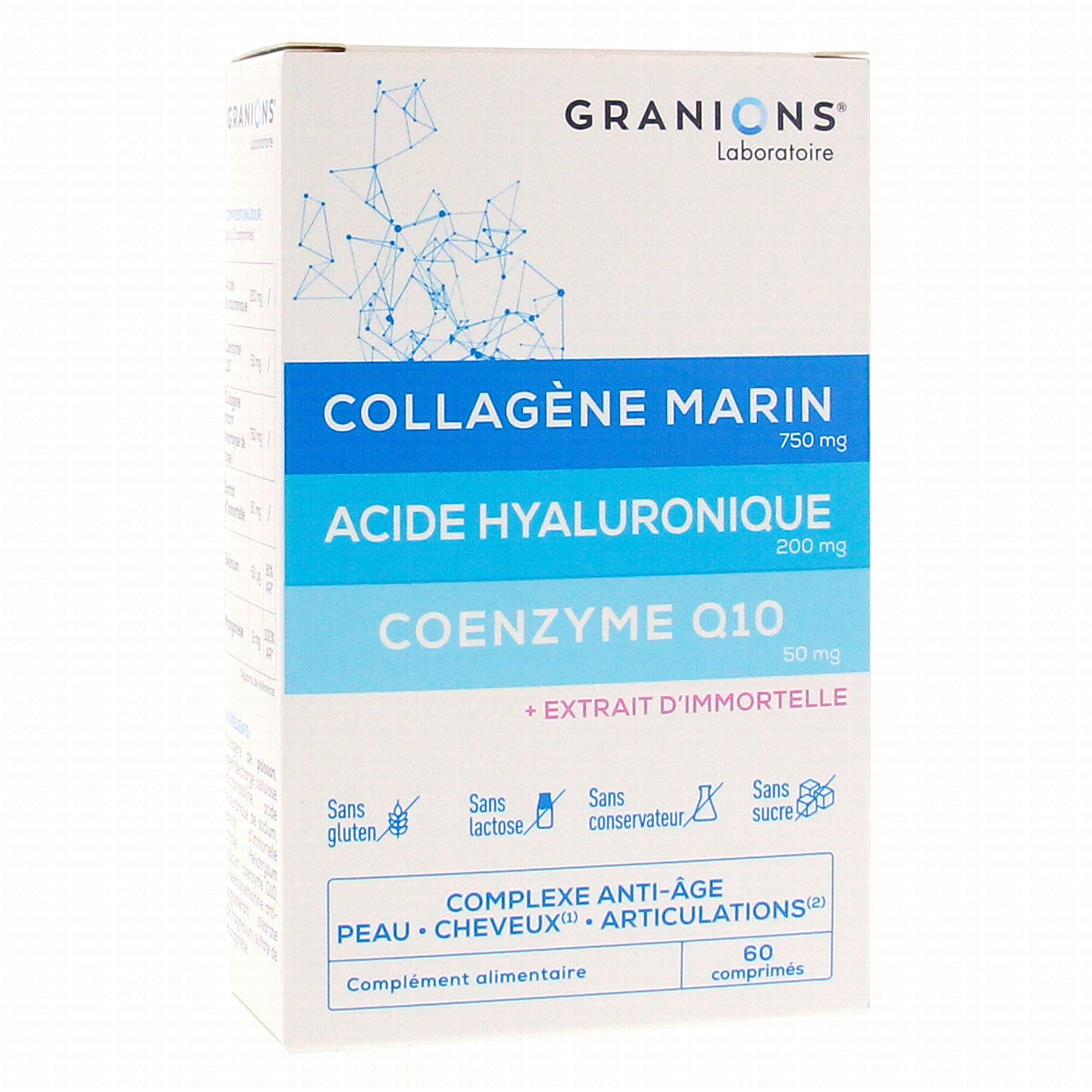 GRANIONS Collagène Marin, Acide Hyaluronique, Coenzyme Q10 60 comprimés contient les éléments suivants :