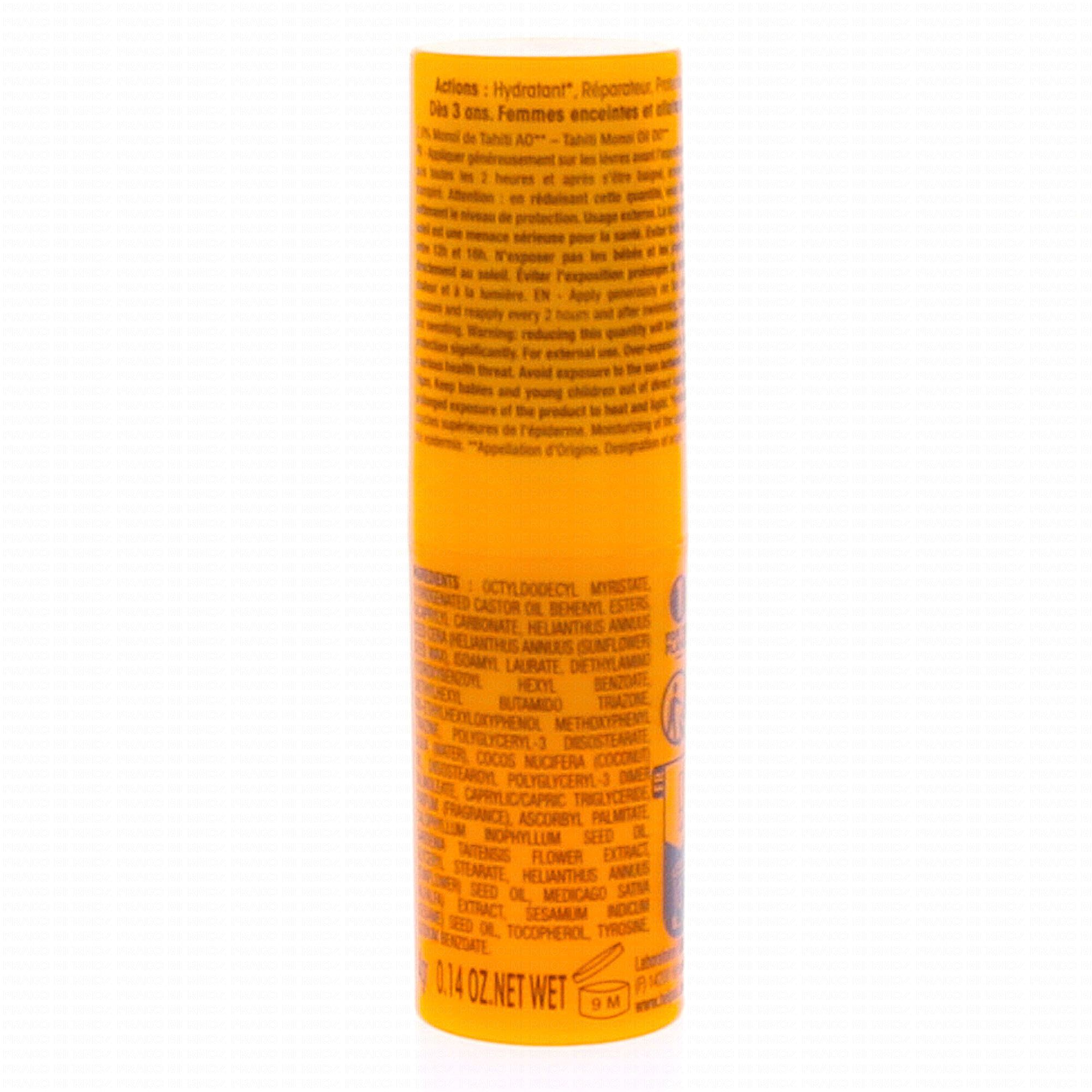 Enrichi au monoï de Tahiti AO ce soin hydrate* et prévient du dessèchement cutané des lèvres, même les plus sensibles. La luzerne BIO va régénèrer et réparer les lèvres du photovieillissement. Ce stick apportera une protection contre les agressions extérieures comme le vent, le sel, le chlore et le froid. L'allié des lèvres été comme hier, à la plage comme à la montagne !