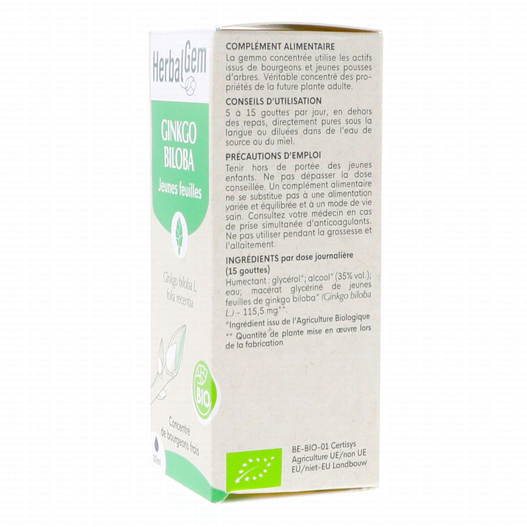 HERBALGEM Concentré du bourgeons frais - Ginkgo Biloba Jeunes feuilles Bio 30ml contient les éléments suivants :