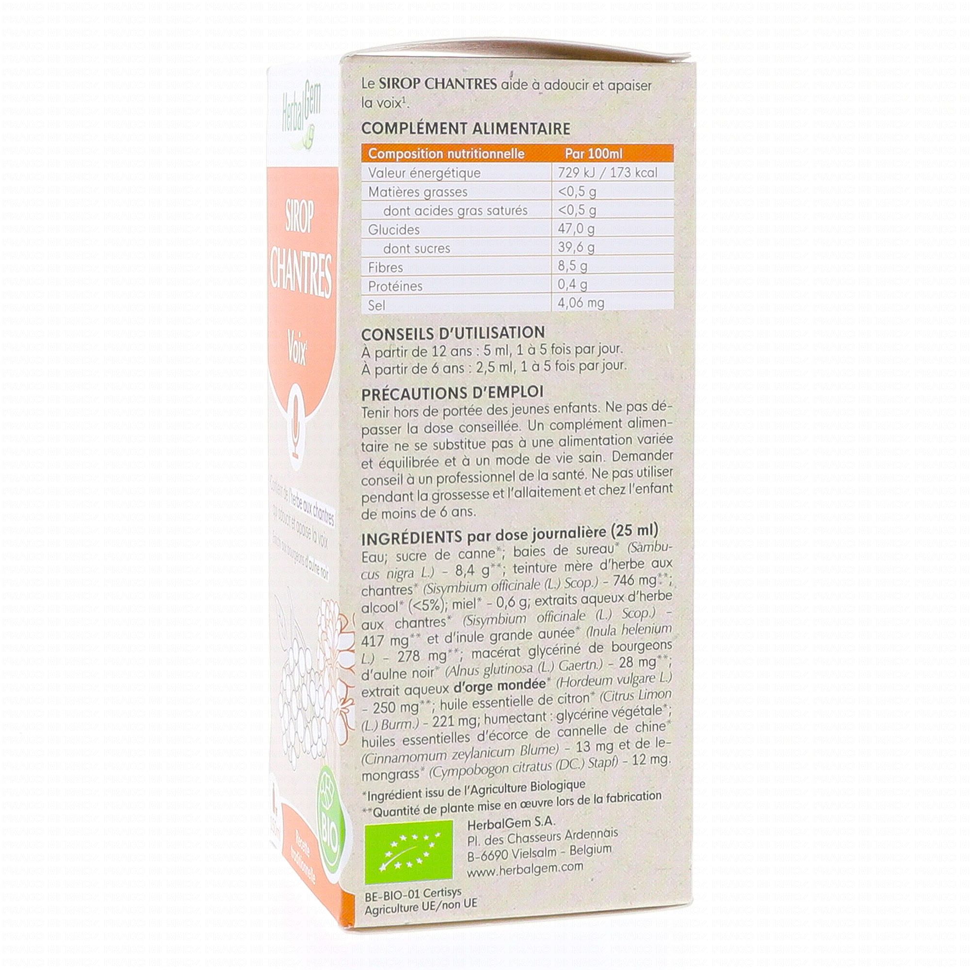 HERBALGEM Sirop des chantres voix bio 150ml contient les éléments suivants :