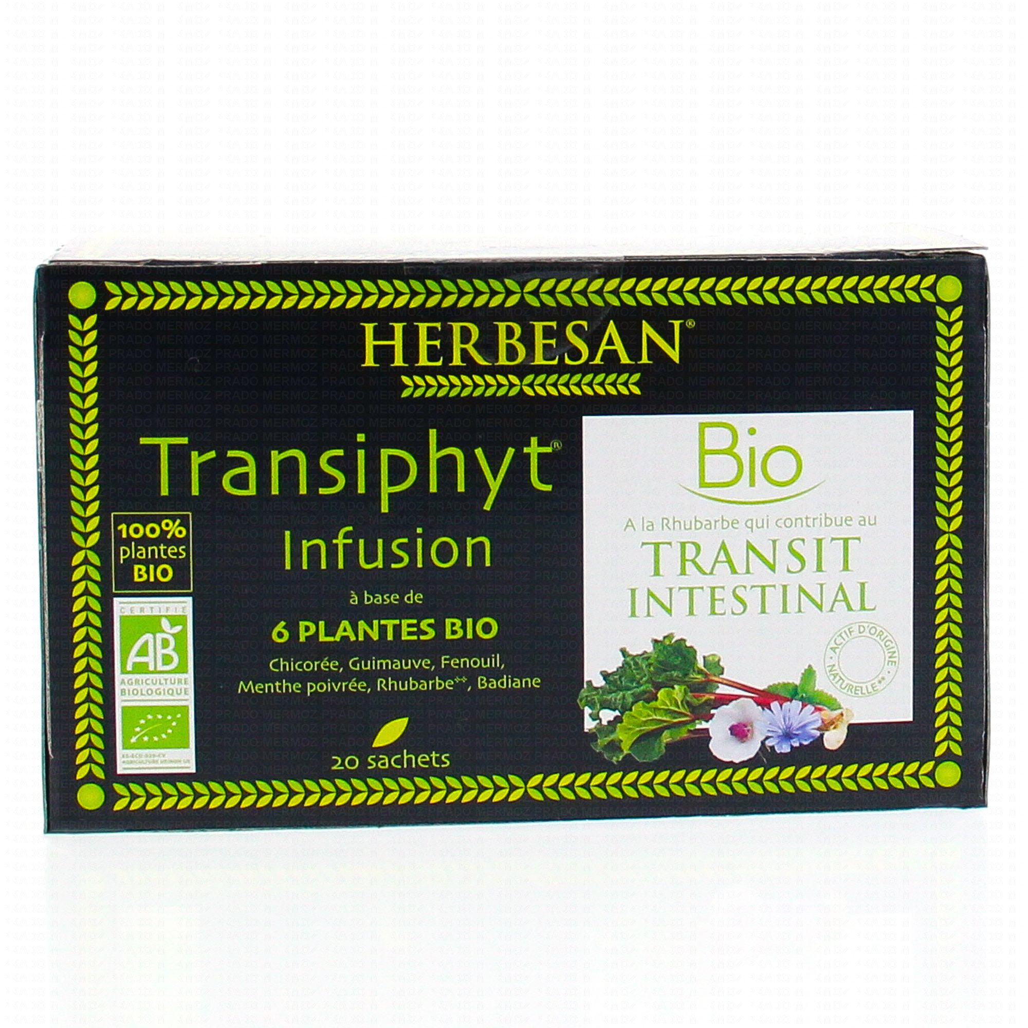 HERBESAN Transiphyt Infusion 20 sachets est un complément alimentaire qui contribue à un meilleur transit intestinal. Elle permet également d'améliorer le confort digestif.