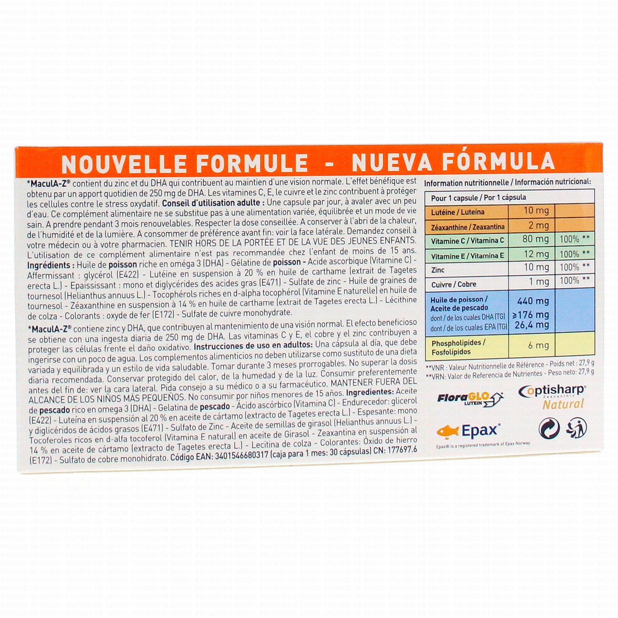 Pour 1 capsule : Acide ascorbique (Vitamine C) : 80 mg (100%*) Zinc : 10 mg (100%*) D-α-tocophérol (Vitamine E) : 12 mg (100%*) Lutéine : 10 mg Zéaxanthine : 2 mg Cuivre : 1 mg (100%*) Huile de poisson : 440 mg dont DHA (TG) ≥189,2 mg dont EPA (TG) 26,4-66 mg MaculA-Z®.