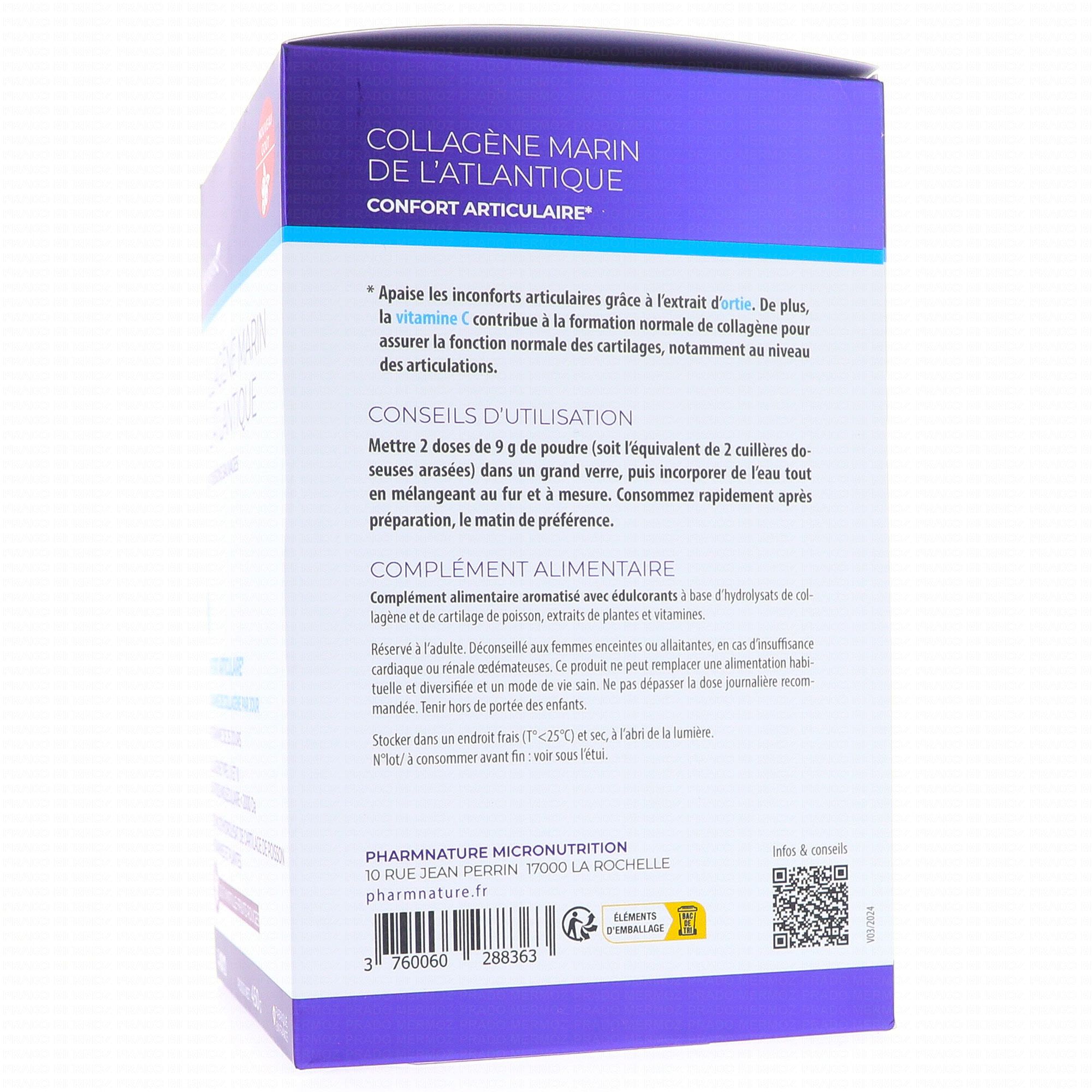 KERSIENS Collagène Marin de L'Atlantique Confort Articulaire 400g est un complément alimentaire qui contribue au confort articulaire grâce à la présence Collagène. Le Frêne aide à maintenir la souplesse des articulations. La vitamine C et la vitamine E favorisent la protection des cellules contre le stress oxydatif.
